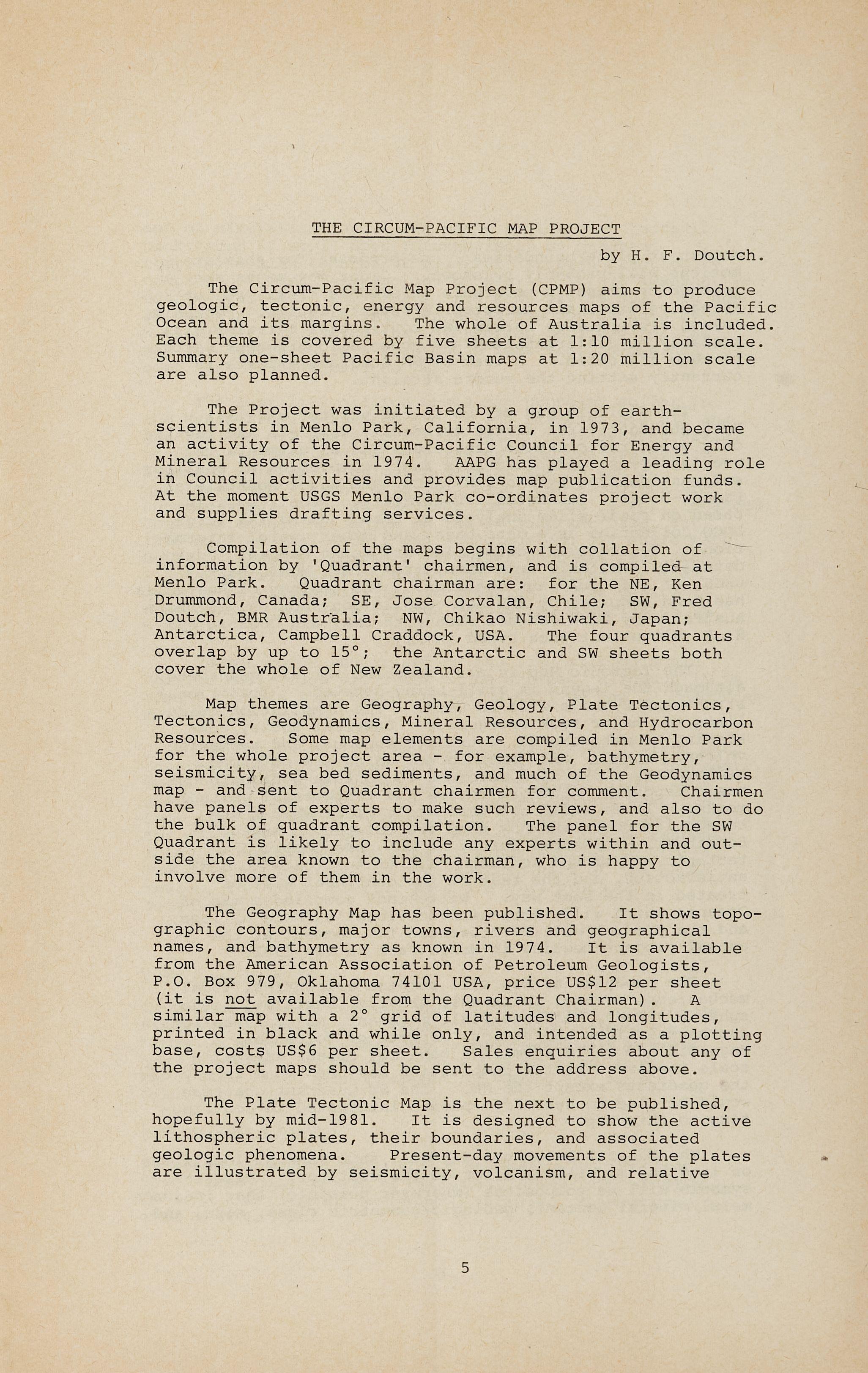 The Tectonic Map is part compiled for all quadrants, although the legend is still being debated. Traditional structural symbols will be used. The Compilation Guide lists two major rock categories - Basement Rocks, consisting of metamorphic, intrusive igneous, and submarine volcanic rocks; and Cover Rocks, which are deformed sedimentary rocks (too deformed to contain hydrocarbons), basin deposits, platform strata and terrestrial volcanic rocks. It is still not absolutely clear what these categories cover and how they are related. Erwin Scheibner, Geological Survey of NSW, has compiled a tectonic map of the southern half of Australia to CPMP's satisfaction, and the rest of the continent will be treated in the same way. Wittekindt compiled a map of Oceania which will marry with Scheibner's, more or less, and the product will be presented for comment at the annual project meeting in Menlo Park in May 1981.