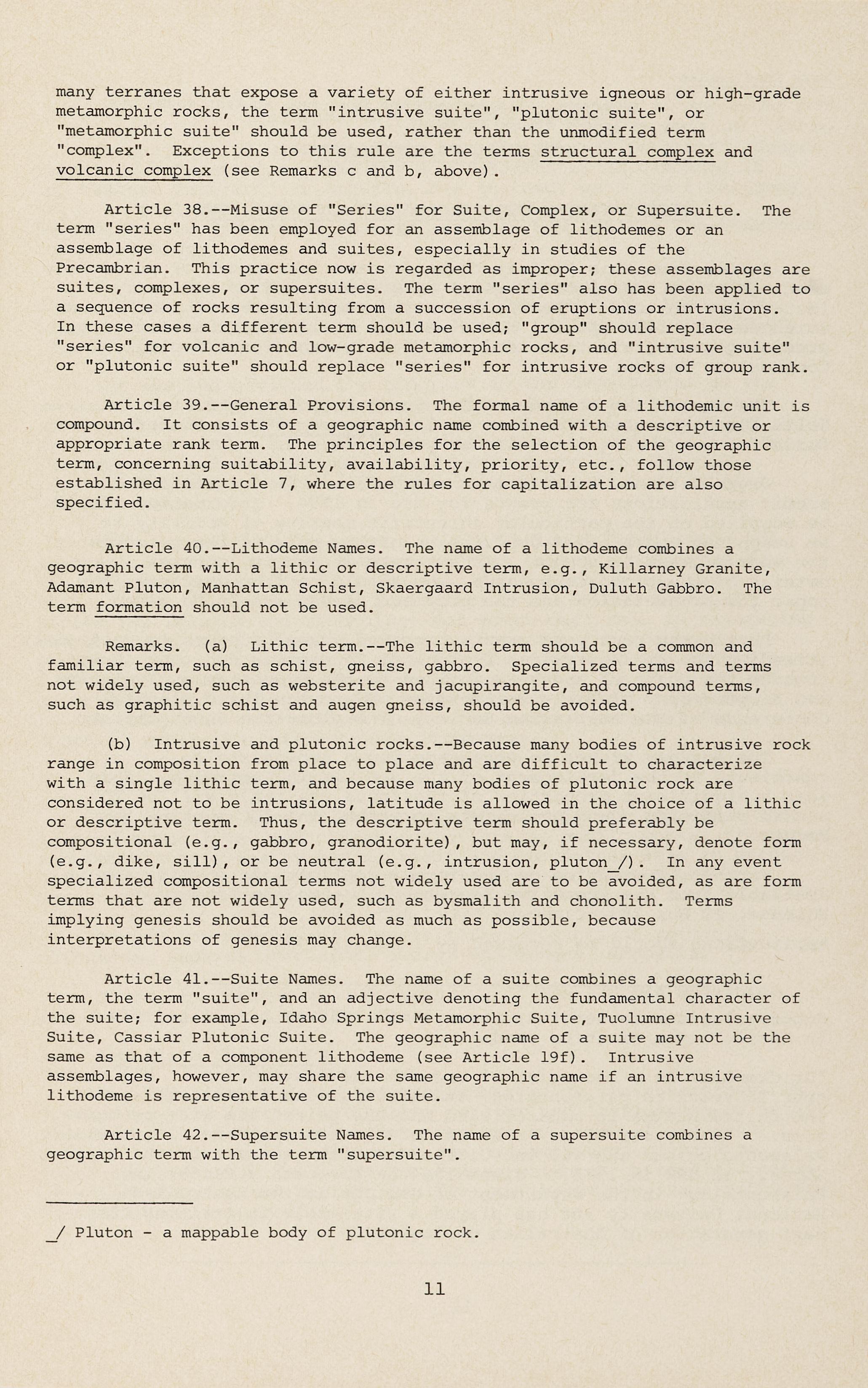Article 38.--Misuse of "Series" for Suite, Complex, or Supersuite. The term "series" has been employed for an assemblage of lithodemes or an assemblage of lithodemes and suites, especially in studies of the Precarnbrian This practice now is regarded as improper; these assemblages are suites, complexes, or supersuites. The term "series" also has been applied to a sequence of rocks resulting from a succession of eruptions or intrusions. In these cases a different term should be used; "group" should replace "series" for volcanic and low-grade metamorphic rocks, and "intrusive suite" or "plutonic suite" should replace "series" for intrusive rocks of group rank.