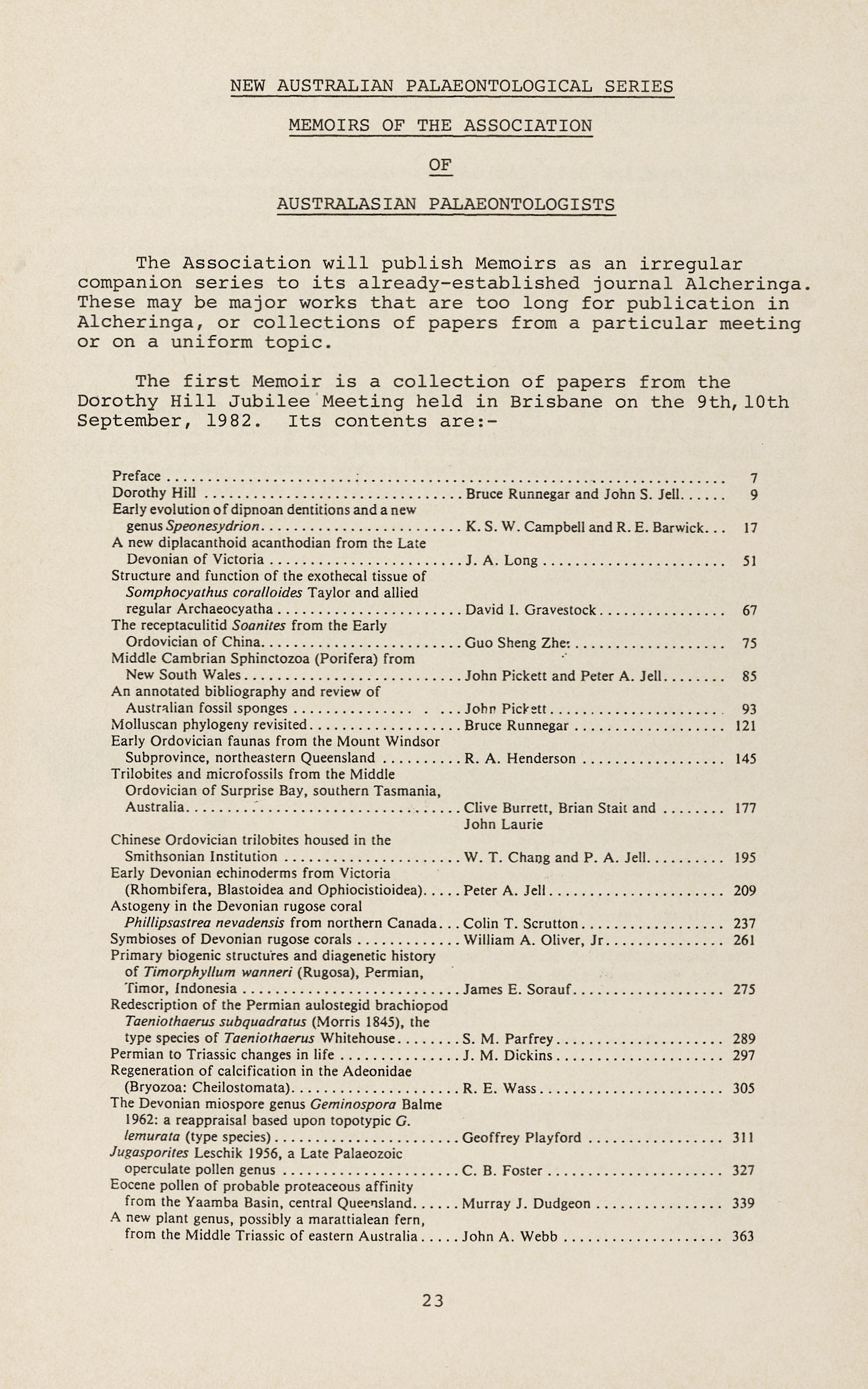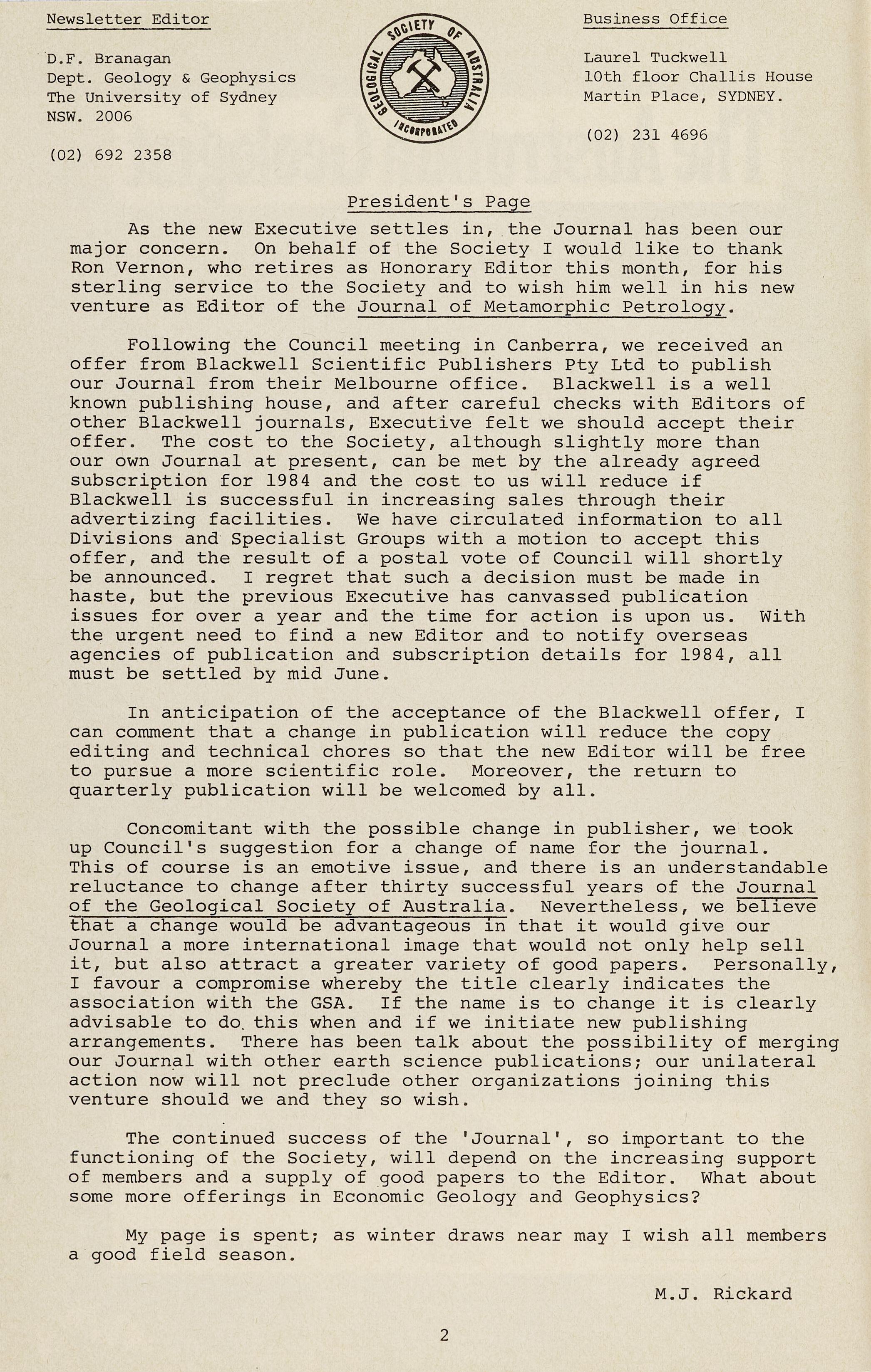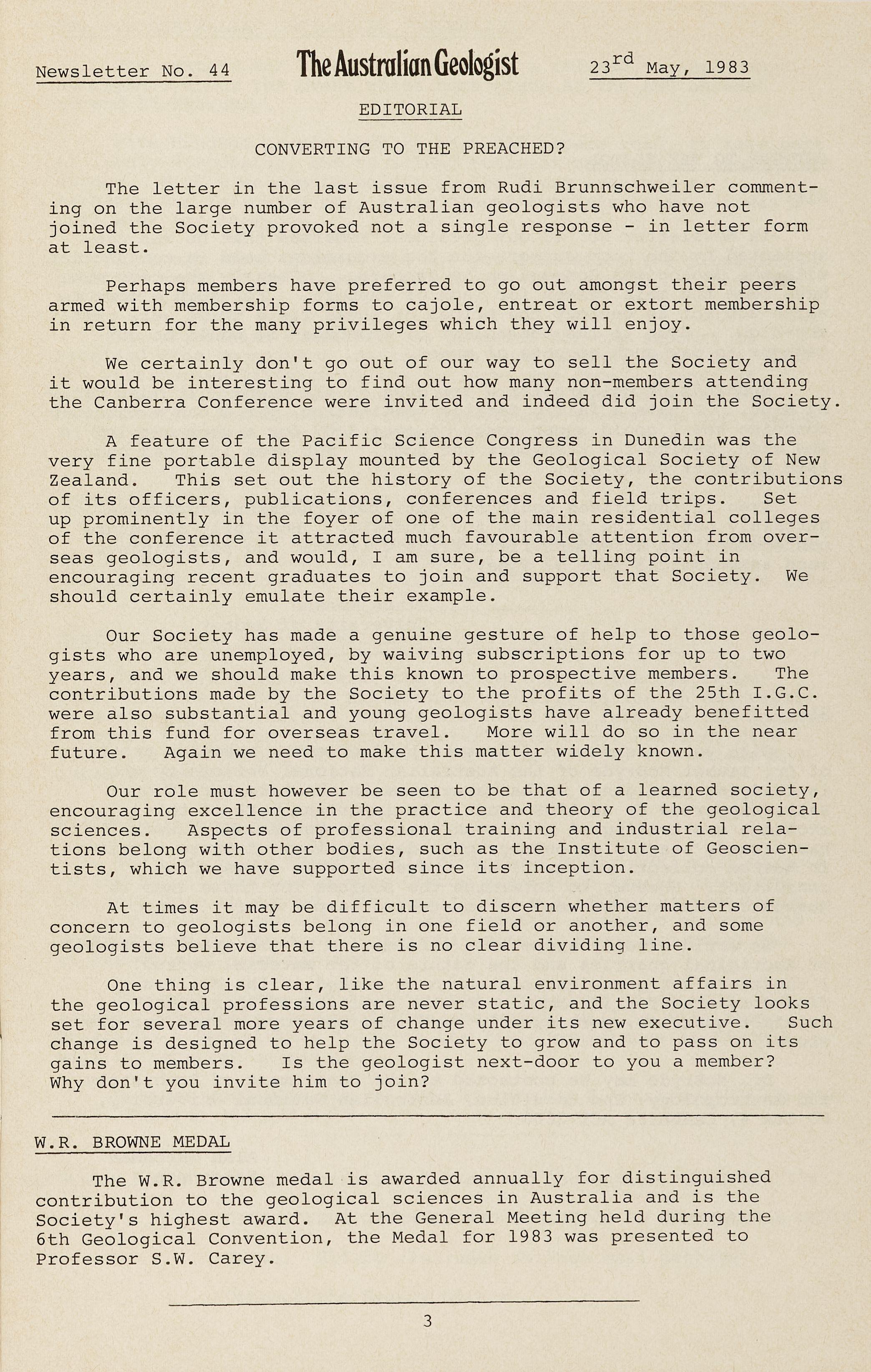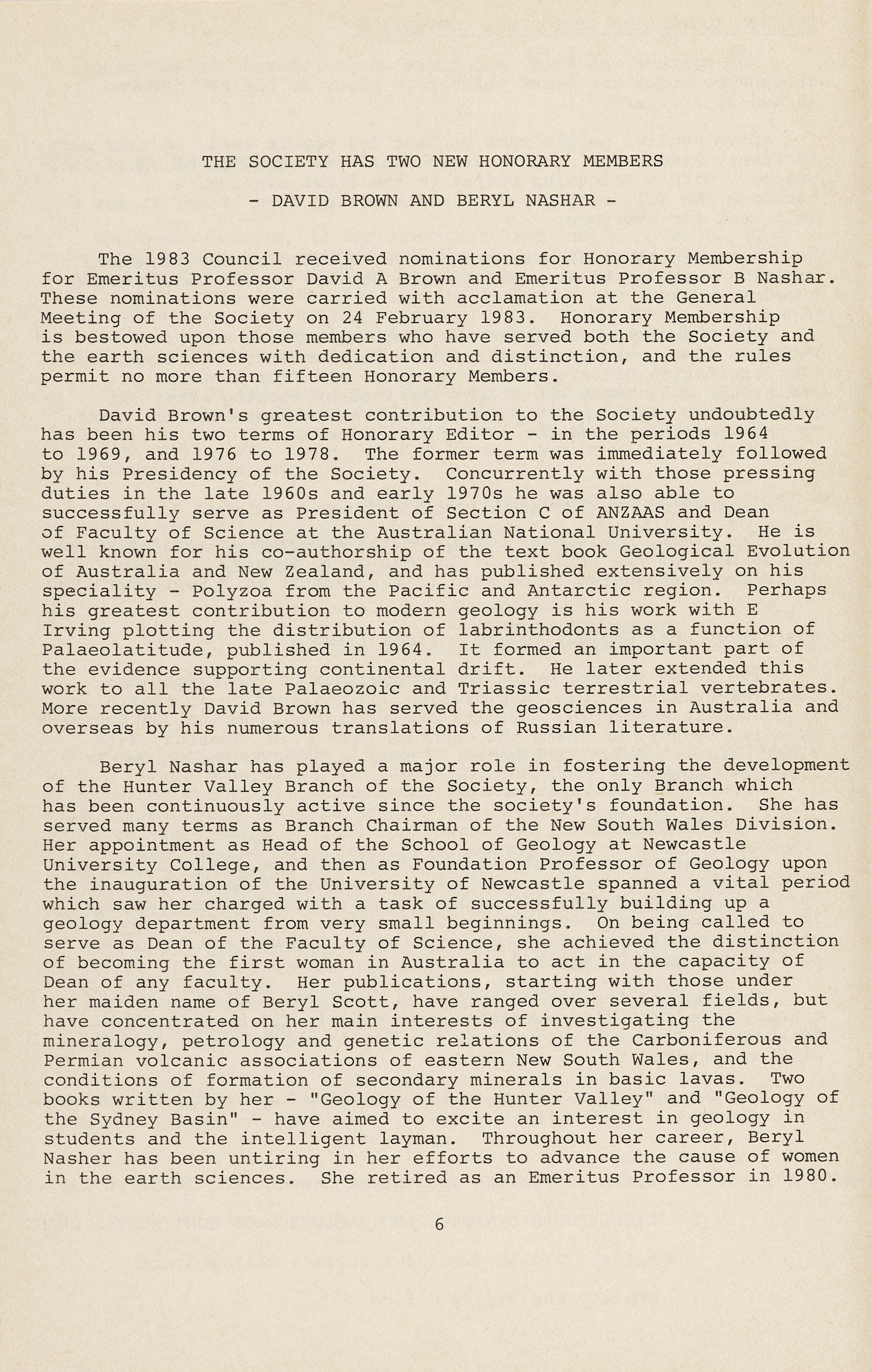 The 1983 Council received nominations for Honorary Membership for Emeritus Professor David A Brown and Emeritus Professor B Nashar. These nominations were carried with acclamation at the General Meeting of the Society on 24 February 1983. Honorary Membership is bestowed upon those members who have served both the Society and the earth sciences with dedication and distinction, and the rules permit no more than fifteen Honorary Members.