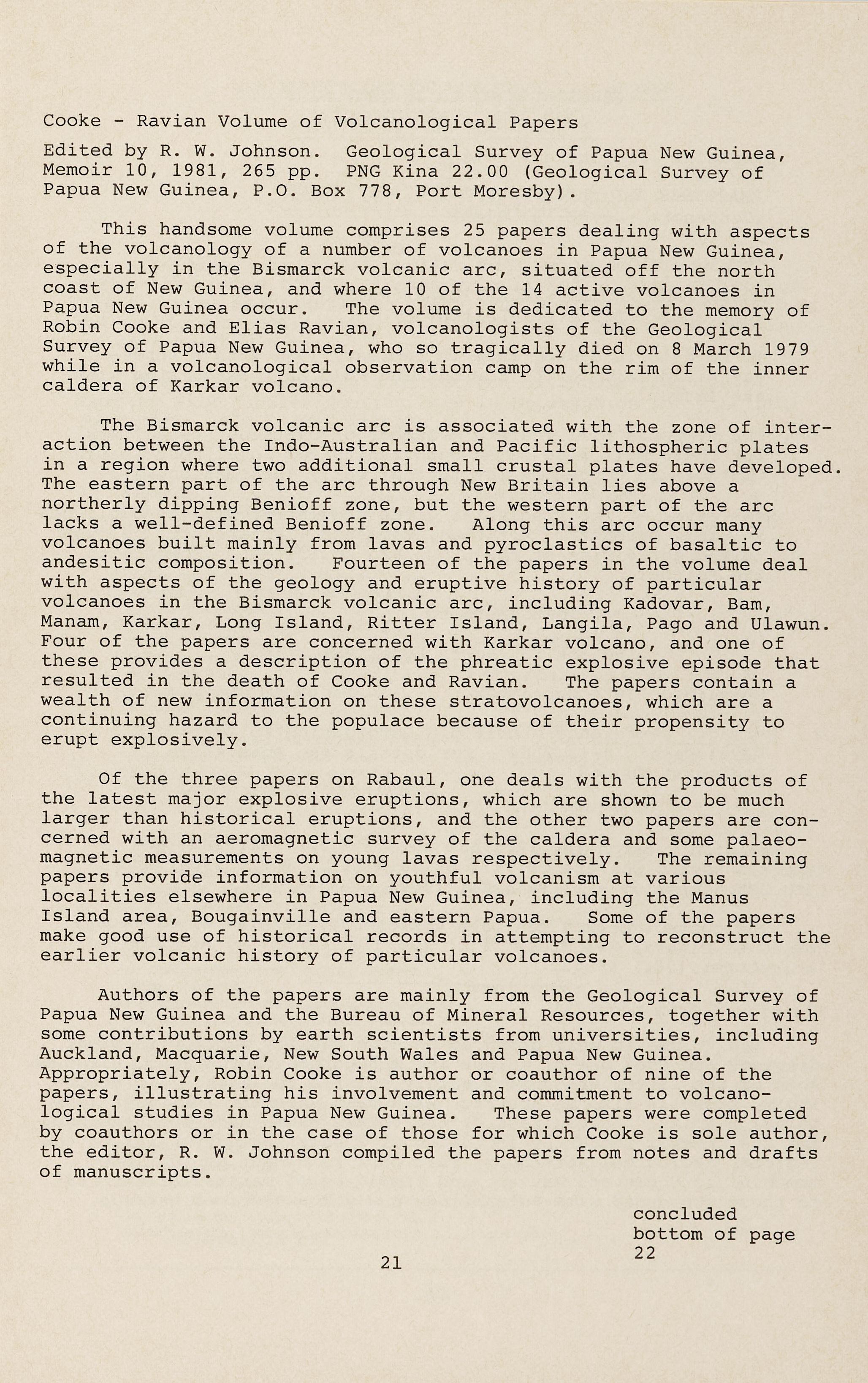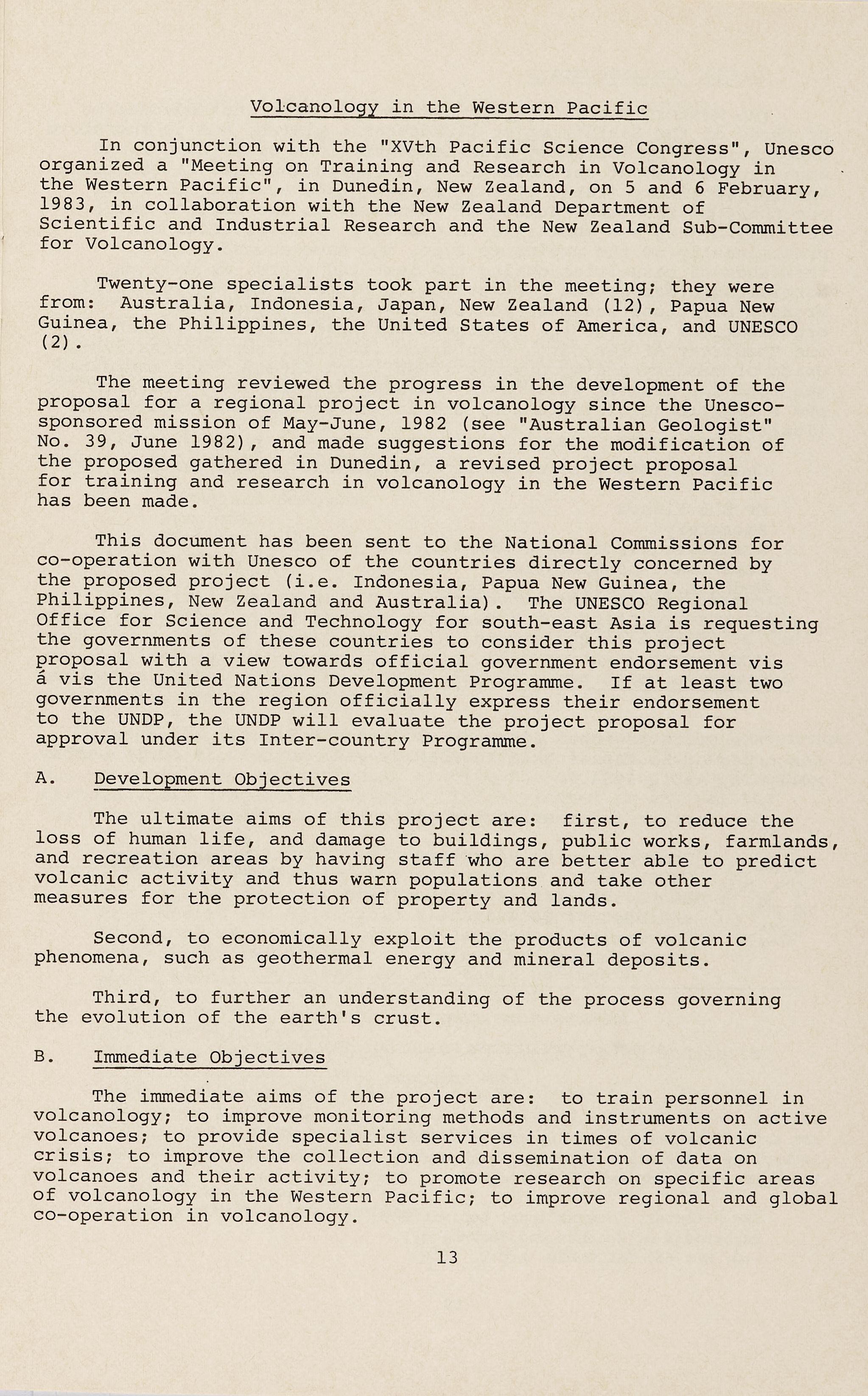 The meeting reviewed the progress in the development of the proposal for a regional project in volcanology since the Unescosponsored mission of May-June, 1982 (see "Australian Geologist" No. 39, June 1982), and made suggestions for the modification of the proposed gathered in Dunedin, a revised project proposal for training and research in volcanology in the Western Pacific has been made.