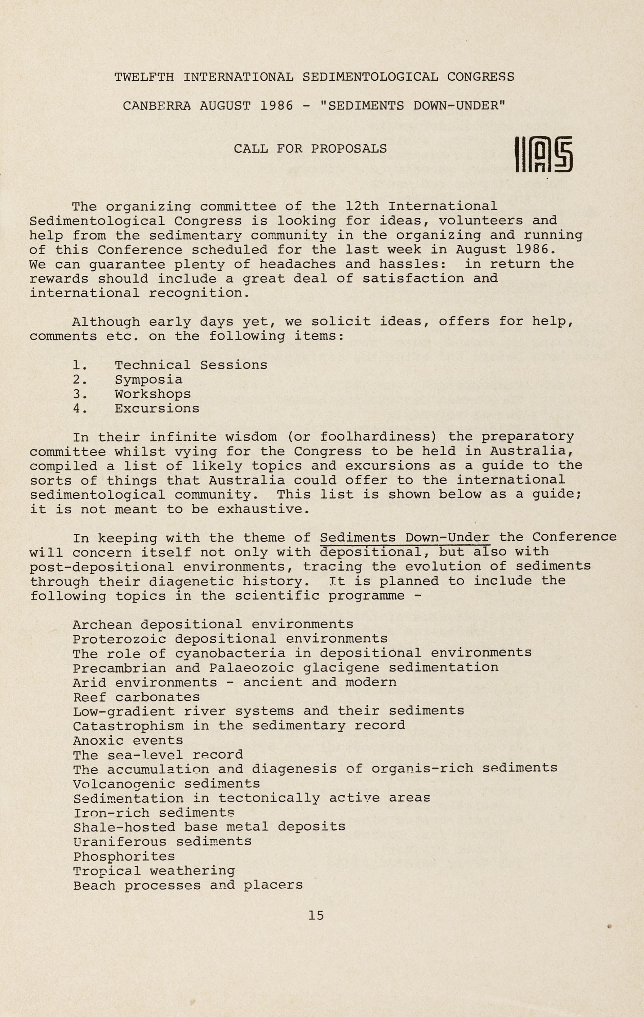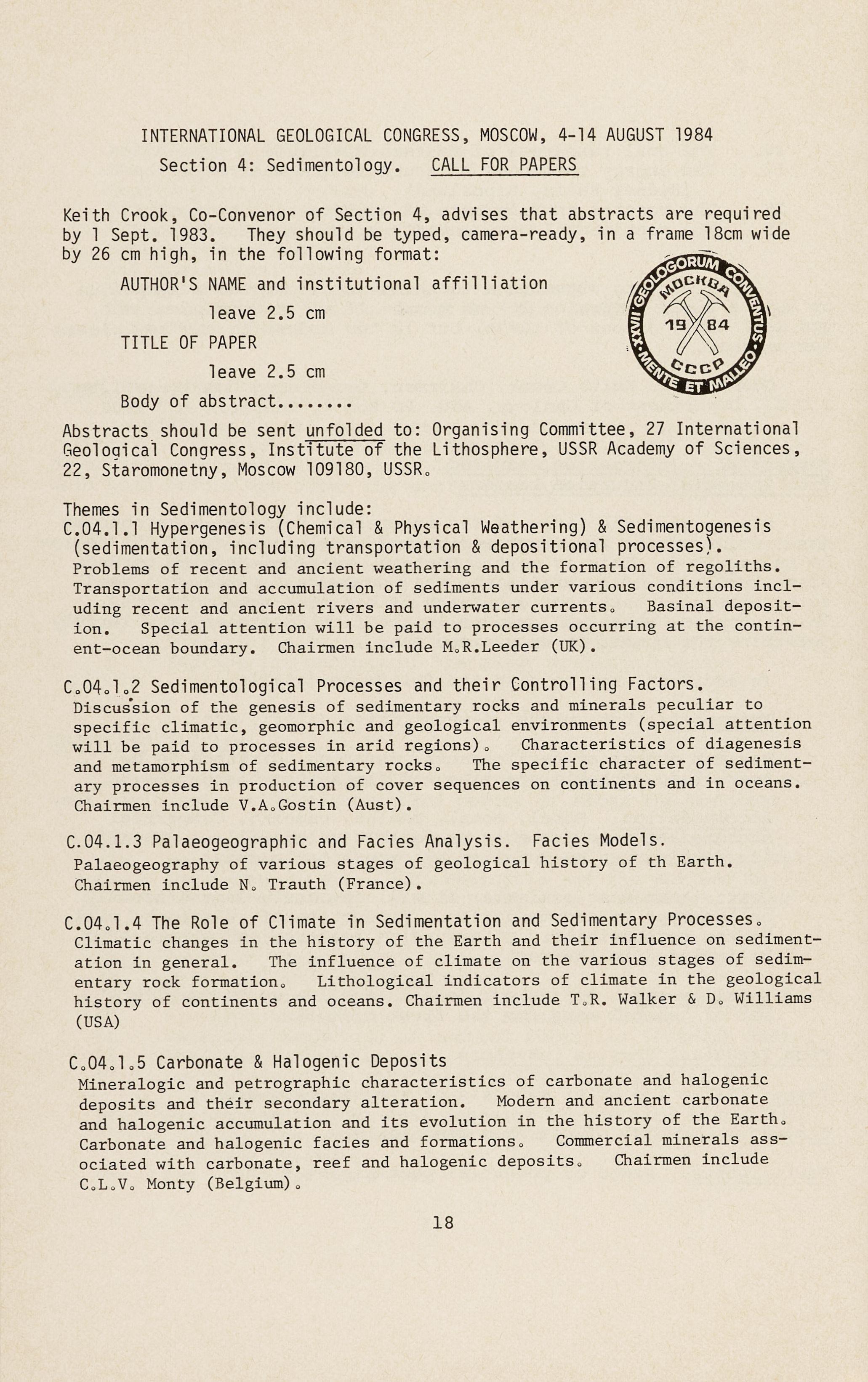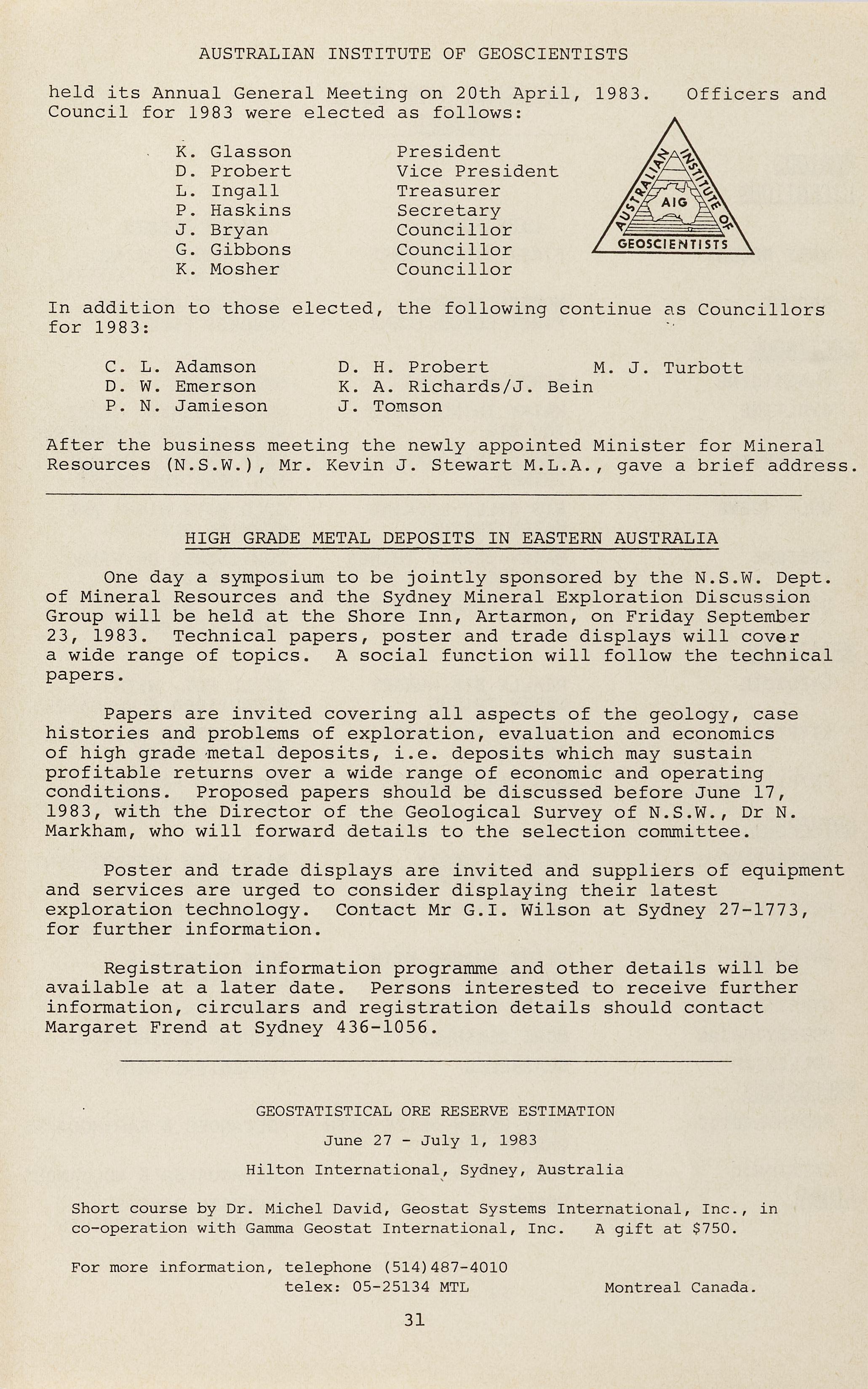Papers are invited covering all aspects of the geology, case histories and problems of exploration, evaluation and economics of high grade -metal deposits, i . e. deposits which may sustain profitable returns over a wide range of economic and operating conditions. Proposed papers should be discussed before June 17, 1983, with the Director of the Geological Survey of N.S.W., Dr N. Markham, who will forward details to the selection committee.
