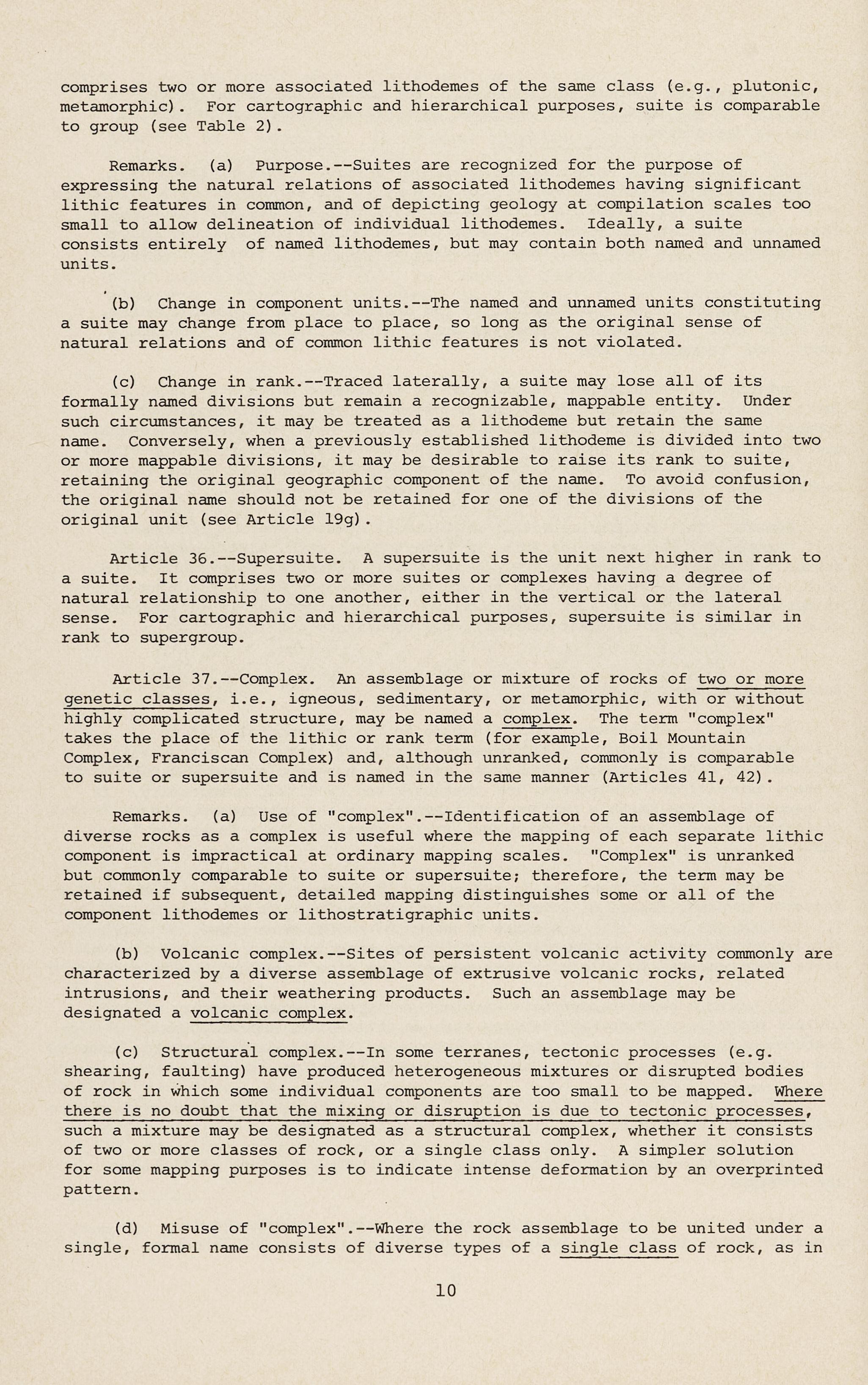 Remarks. (a) Use of "complex" .--Identification of an assemblage of diverse rocks as a complex is useful where the mapping of each separate lithic component is impractical at ordinary mapping scales. "Complex" is unranked but commonly comparable to suite or supersuite; therefore, the term may be retained if subsequent, detailed mapping distinguishes some or all of the component lithodemes or lithostratigraphic units.