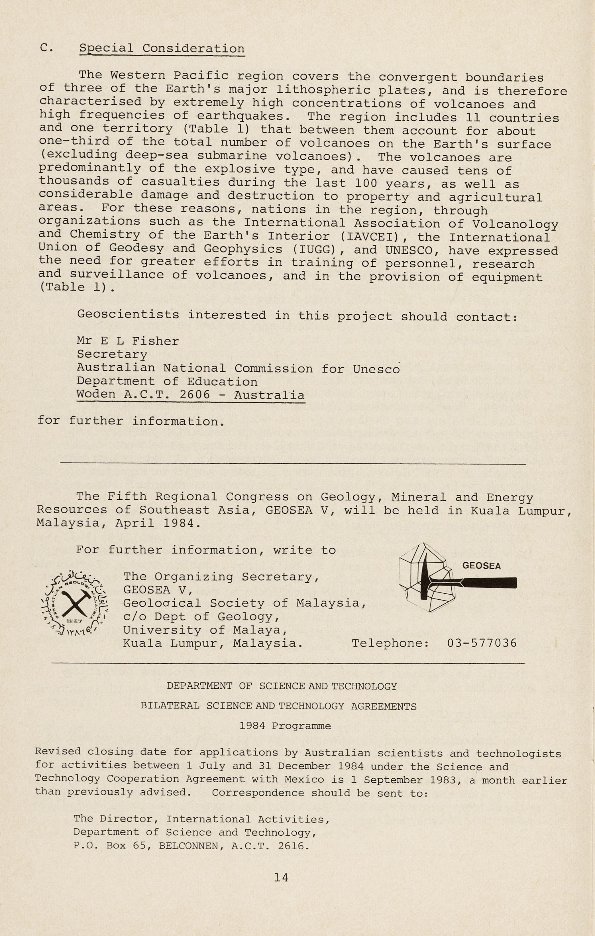 In conjunction with the "XVth Pacific Science Congress", Unesco organized a "Meeting on Training and Research in Volcanology in the Western Pacific", in Dunedin, New Zealand, on 5 and 6 February, 1983, in collaboration with the New Zealand Department of Scientific and Industrial Research and the New Zealand Sub-Committee for Volcanology.