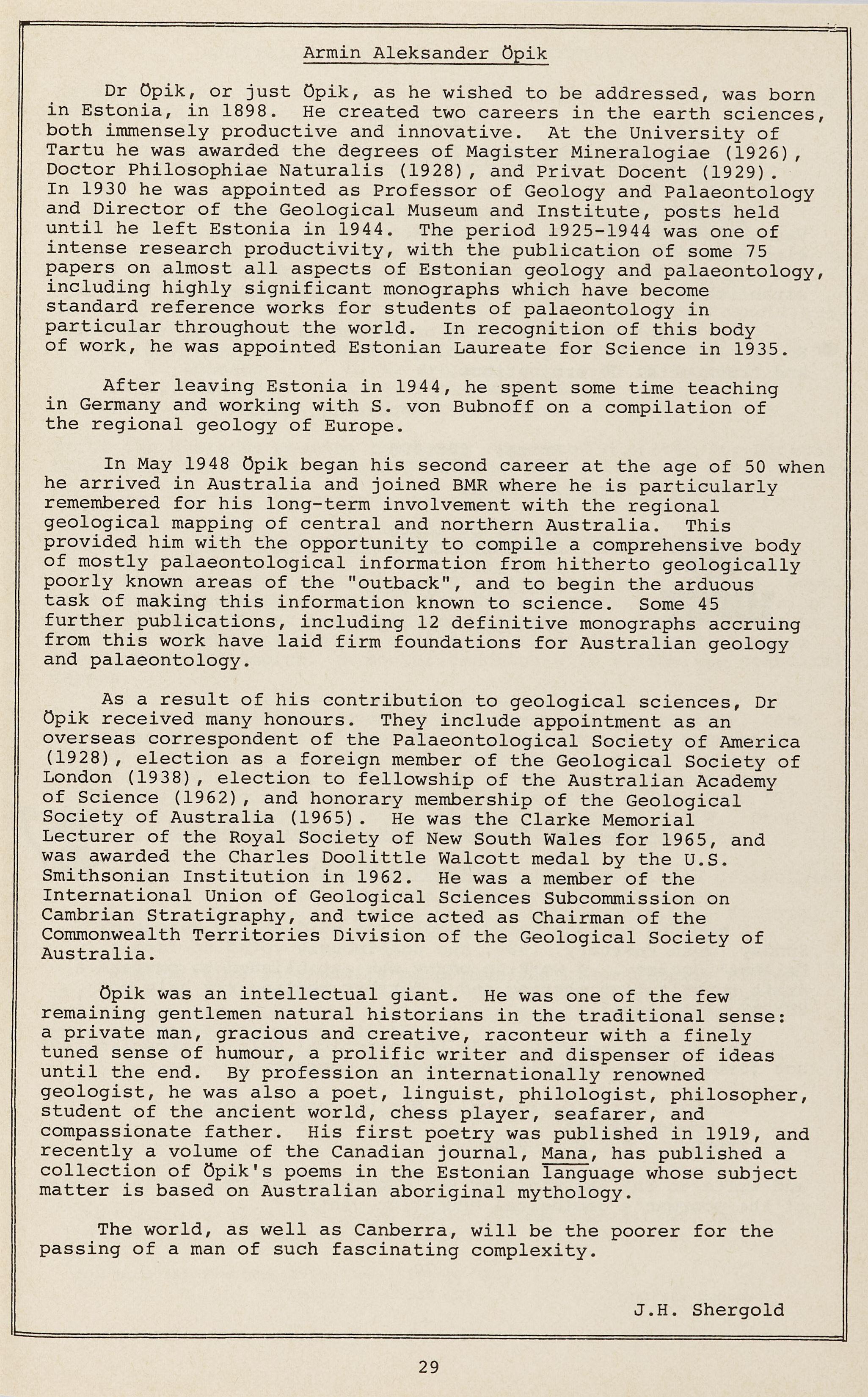Dr Opik, or just Opik, as he wished to be addressed, was born in Estonia, in 1898 He created two careers in the earth sciences, both immensely productive and innovative. At the University of Tartu he was awarded the degrees of Magister Mineralogiae (1926), Doctor Philosophiae Naturalis (1928), and Privat Docent (1929). In 1930 he was appointed as Professor of Geology and Palaeontology and Director of the Geological Museum and Institute, posts held until he left Estonia in 1944. The period 1925-1944 was one of intense research productivity, with the publication of some 75 papers on almost all aspects of Estonian geology and palaeontology, including highly significant monographs which have become standard reference works for students of palaeontology in particular throughout the world. In recognition of this body of work, he was appointed Estonian Laureate for Science in 1935.