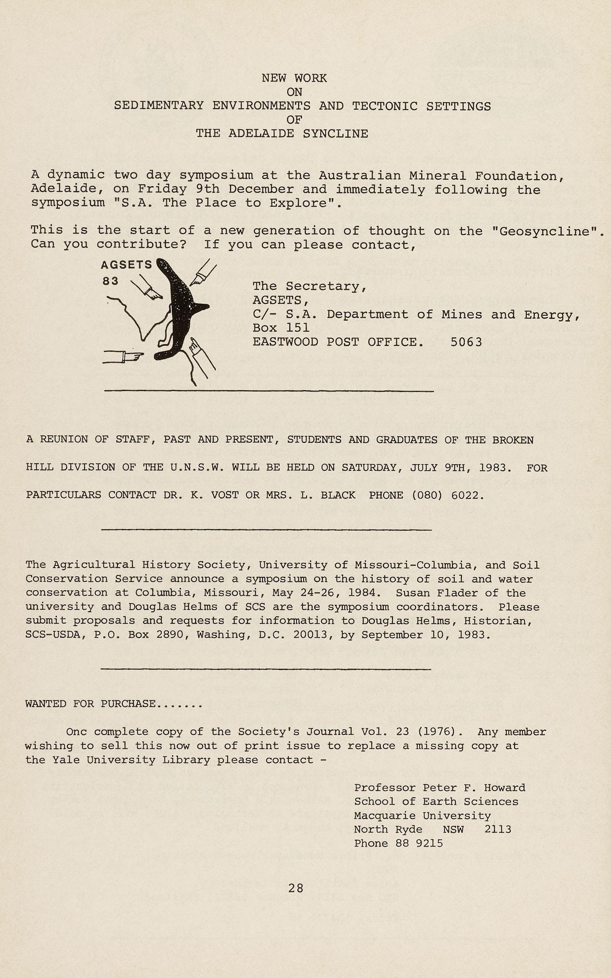 The Agricultural History Society, University of Missouri-Columbia, and Soil Conservation Service announce a symposium on the history of soil and water conservation at Columbia, Missouri, May 24-26, 1984. Susan Flader of the university and Douglas Helms of SCS are the symposium coordinators. Please submit proposals and requests for information to Douglas Helms, Historian, SCS-USDA, P.O. Box 2890, Washing, D.C. 20013, by September 10, 1983.