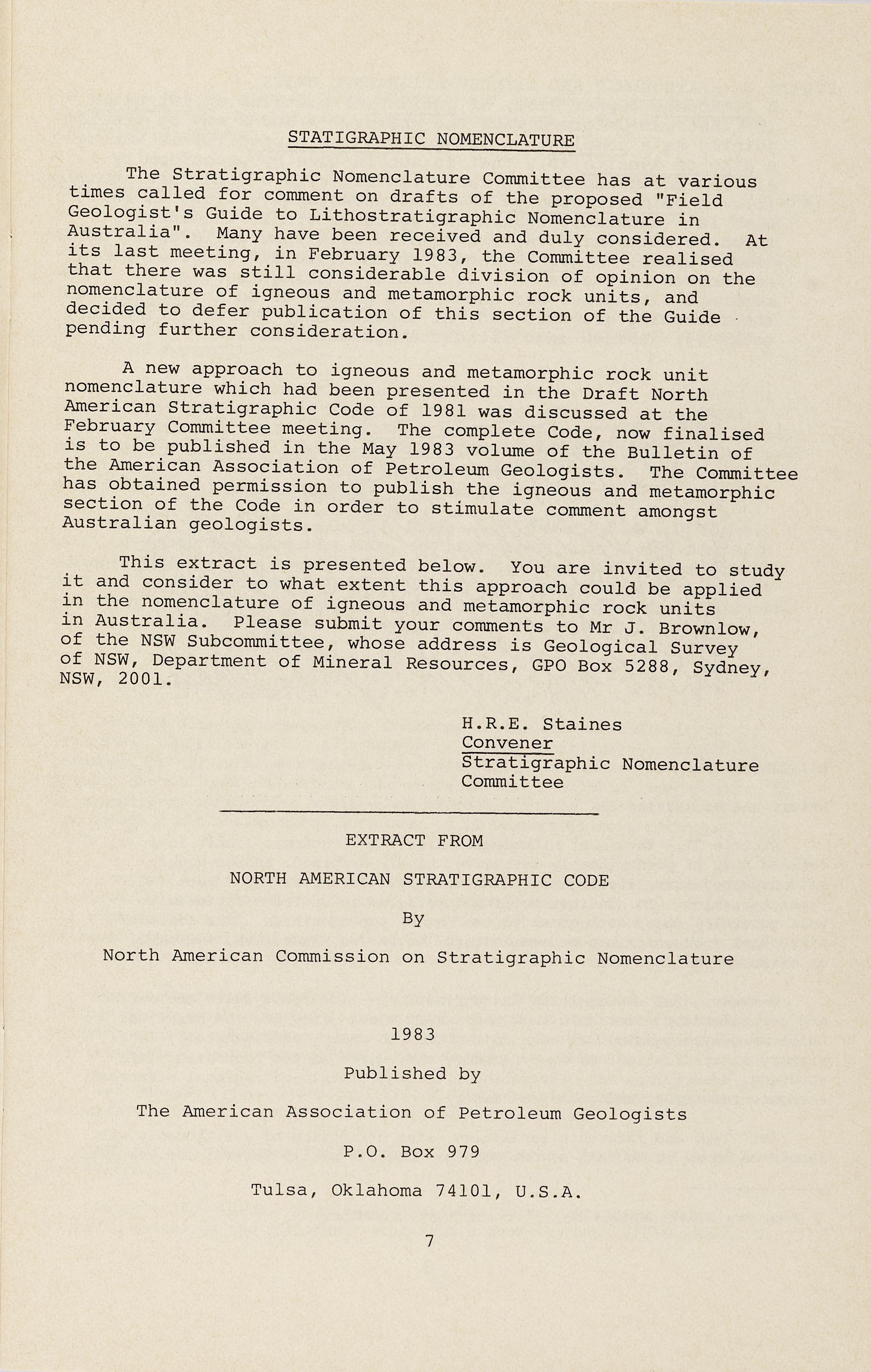A new approach to igneous and metamorphic rock unit nomenclature which had been presented in the Draft North American Stratigraphic Code of 1981 was discussed at the February Committee meeting . The complete Code, now finalised is to be published in the May 1983 volume of the Bulletin of the American Association of Petroleum Geologists. The Committee has obtained permission to publish the igneous and metamorphic section of the Code in order to stimulate comment amongst Australian geologists .