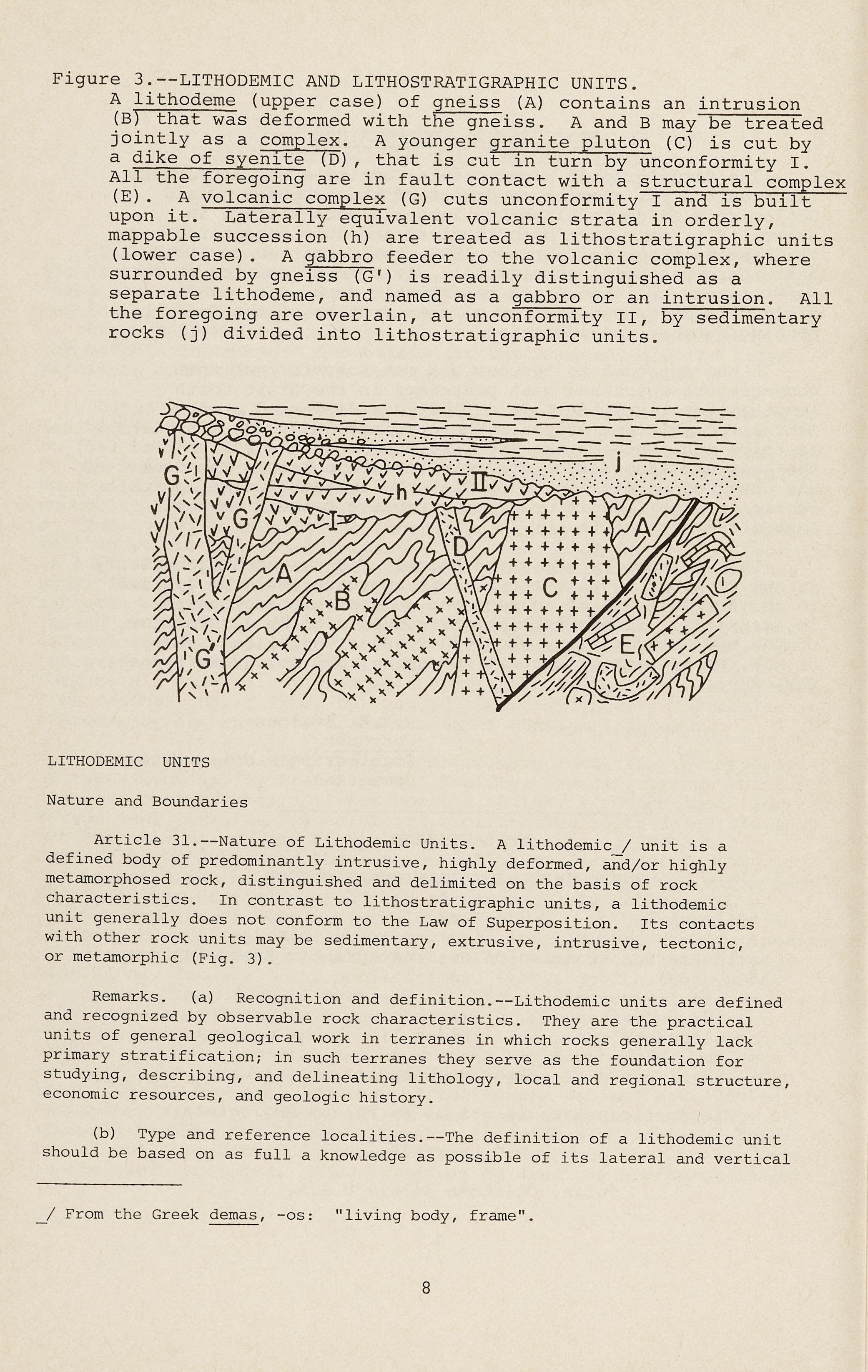 Article 31.--Nature of Lithodemic Units. A lithodemic / unit is a defined body of predominantly intrusive, highly deformed, and/or highly metamorphosed rock, distinguished and delimited on the basis of rock characteristics. In contrast to lithostratigraphic units, a lithodemic unit generally does not conform to the Law of Superposition . Its contacts with other rock units may be sedimentary, extrusive, intrusive, tectonic, or metamorphic (Fig. 3).