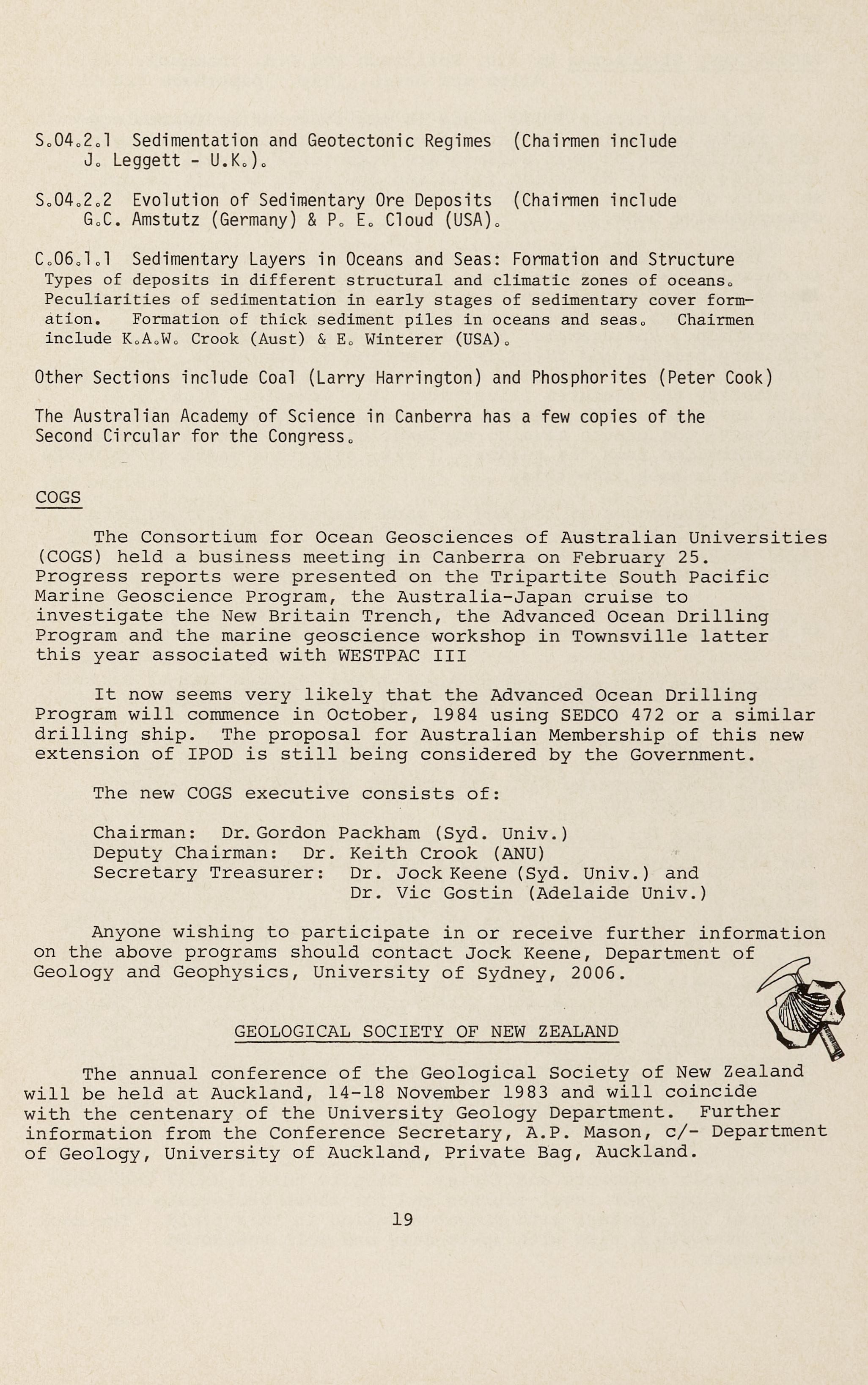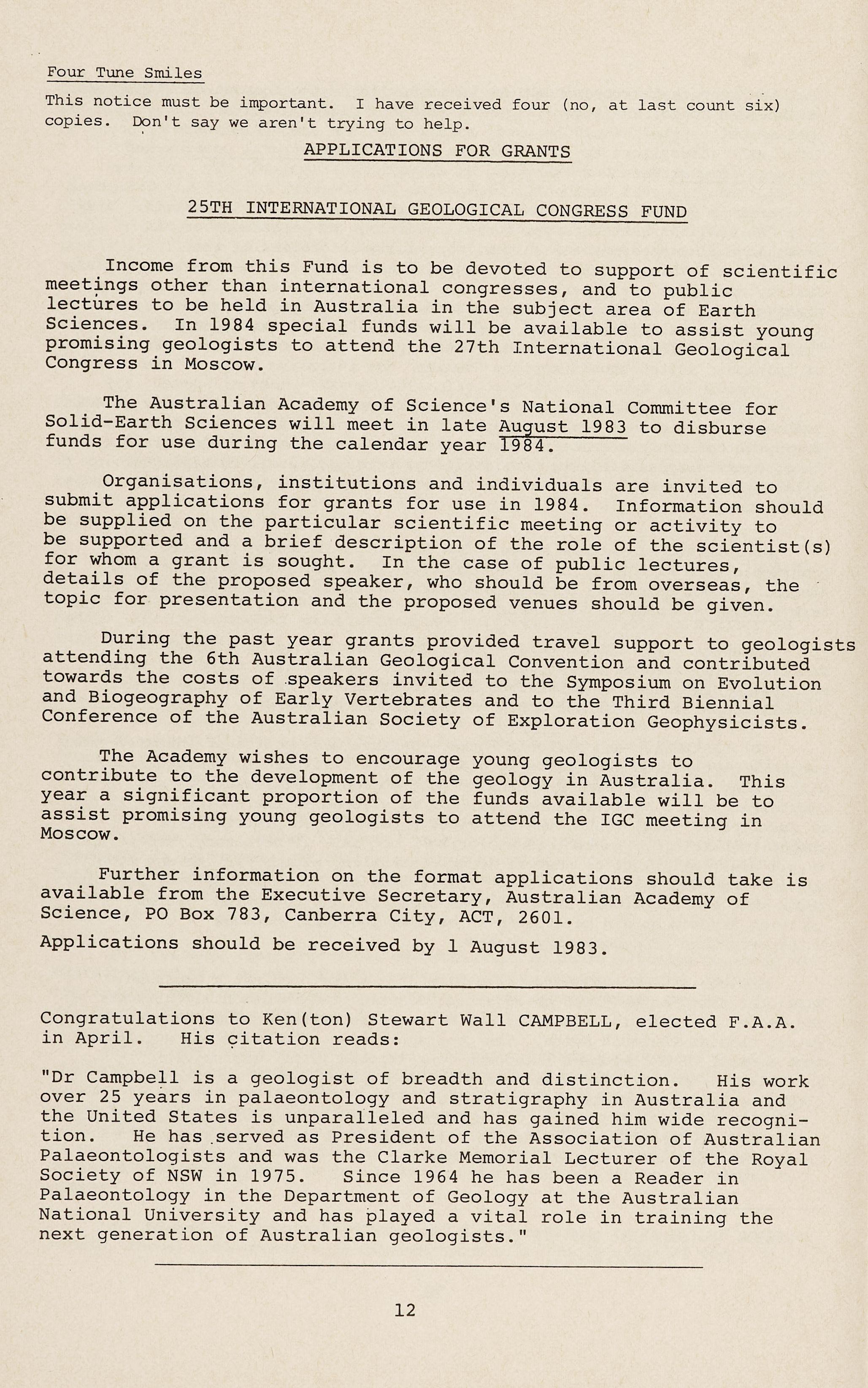 The Academy wishes to encourage young geologists to contribute to the development of the geology in Australia. This year a significant proportion of the funds available will be to assist promising young geologists to attend the IGC meeting in Moscow.
