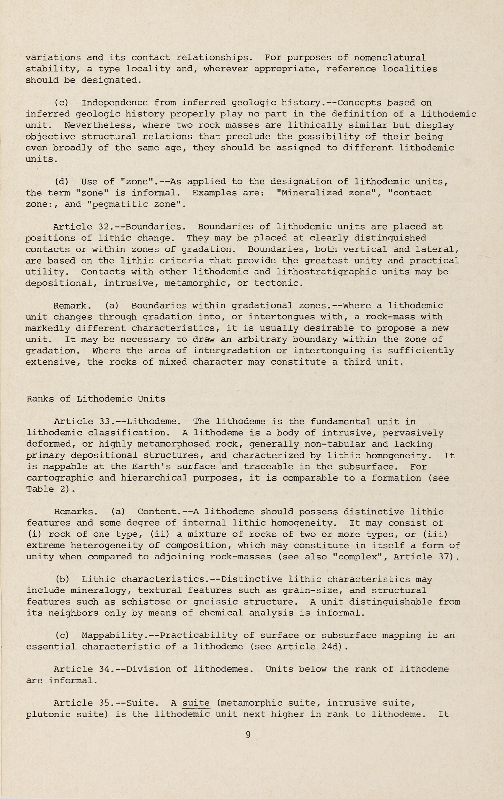Article 32.--Boundaries. Boundaries of lithodemic units are placed at positions of lithic change. They may be placed at clearly distinguished contacts or within zones of gradation. Boundaries, both vertical and lateral, are based on the lithic criteria that provide the greatest unity and practical utility . Contacts with other lithodemic and lithostratigraphic units may be depositional, intrusive, metamorphic, or tectonic.