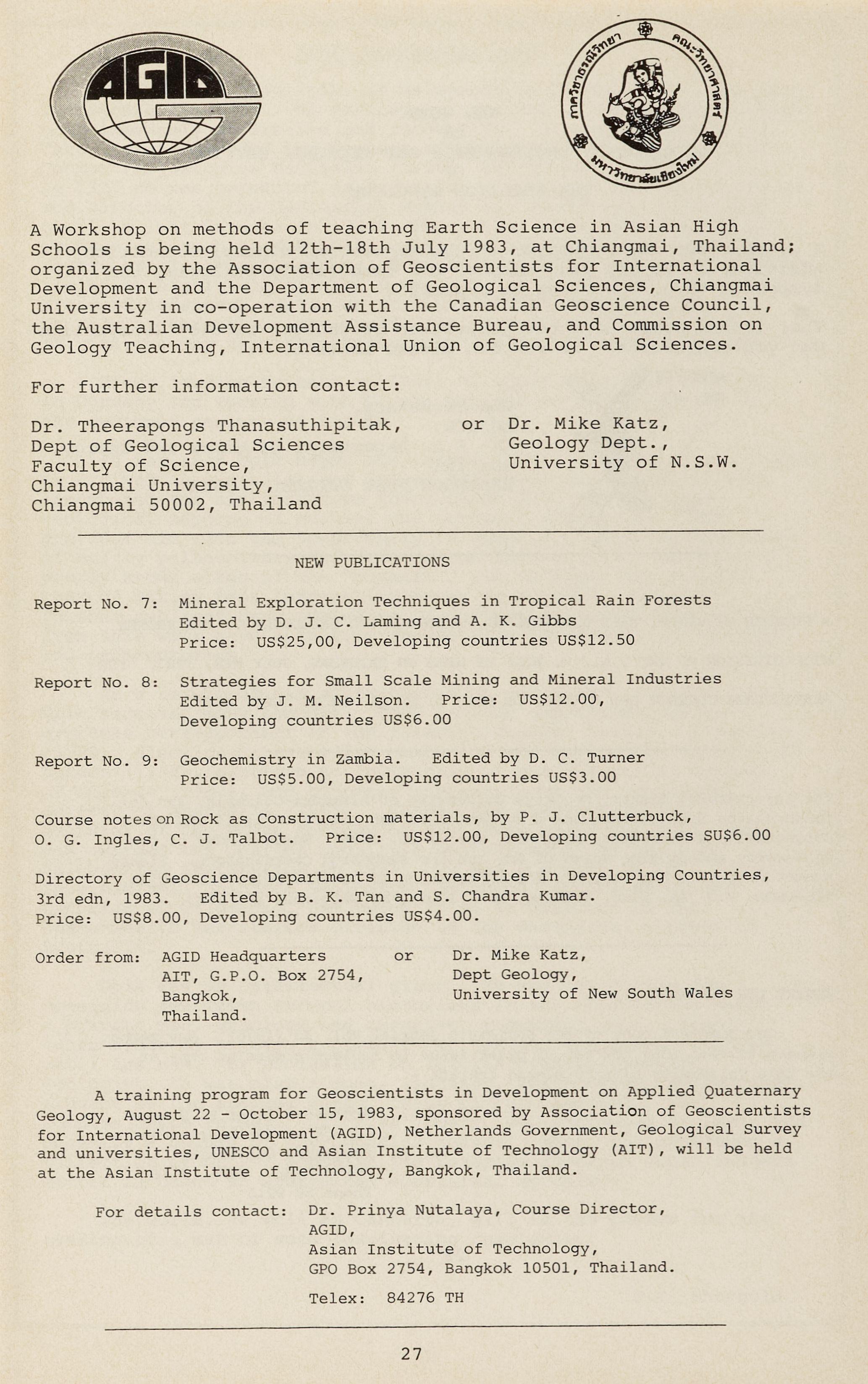 A Workshop on methods of teaching Earth Science in Asian High Schools is being held 12th-18th July 1983, at Chiangmai, Thailand; organized by the Association of Geoscientists for International Development and the Department of Geological Sciences, Chiangmai University in co-operation with the Canadian Geoscience Council, the Australian Development Assistance Bureau, and Commission on Geology Teaching, International Union of Geological Sciences.