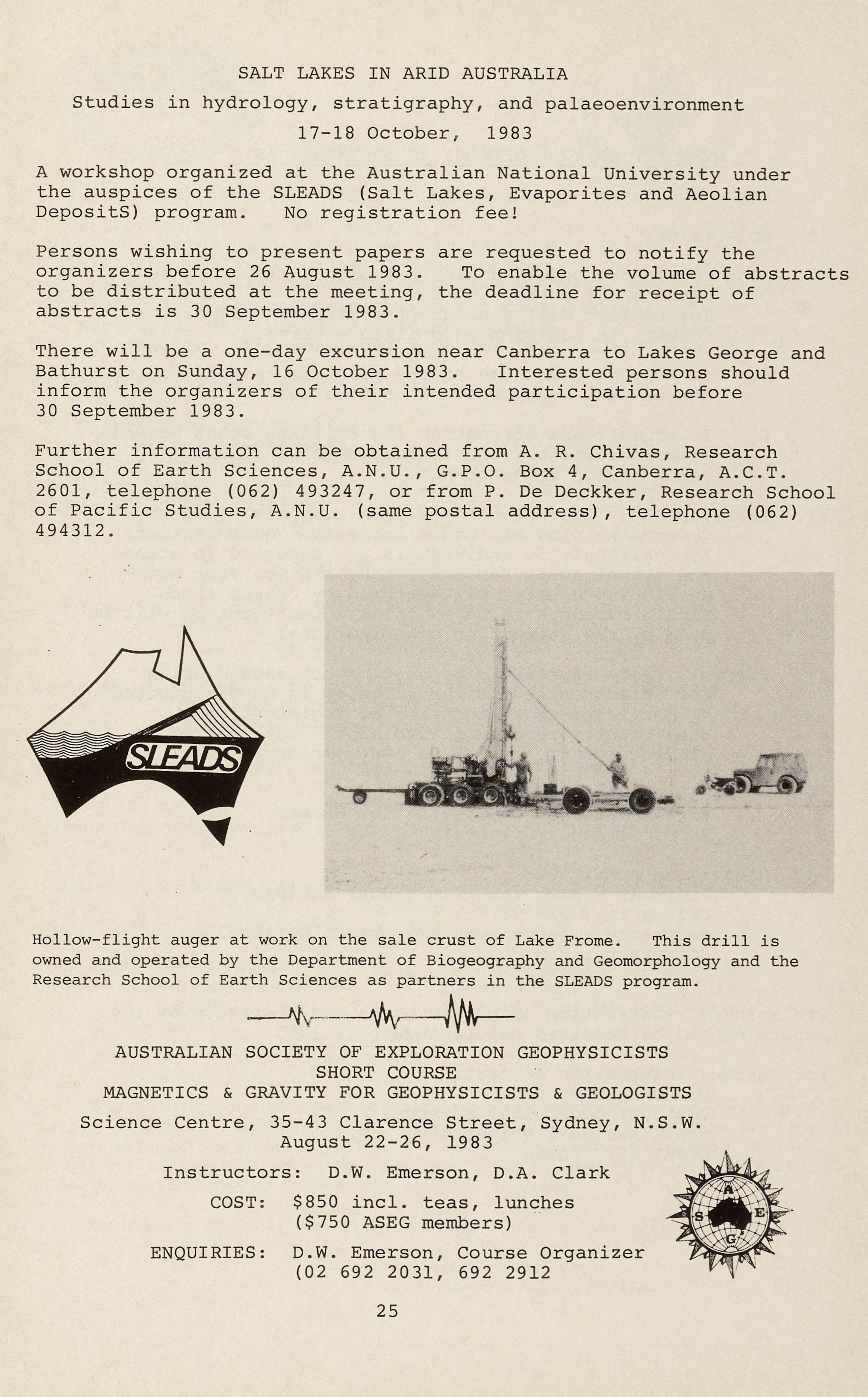 One day a symposium to be jointly sponsored by the N.S . W. Dept . of Mineral Resources and the Sydney Mineral Exploration Discussion Group will be held at the Shore Inn, Artarmon, on Friday September 23, 1983 . Technical papers, poster and trade displays will cover a wide range of topics . A social function will follow the technical papers.