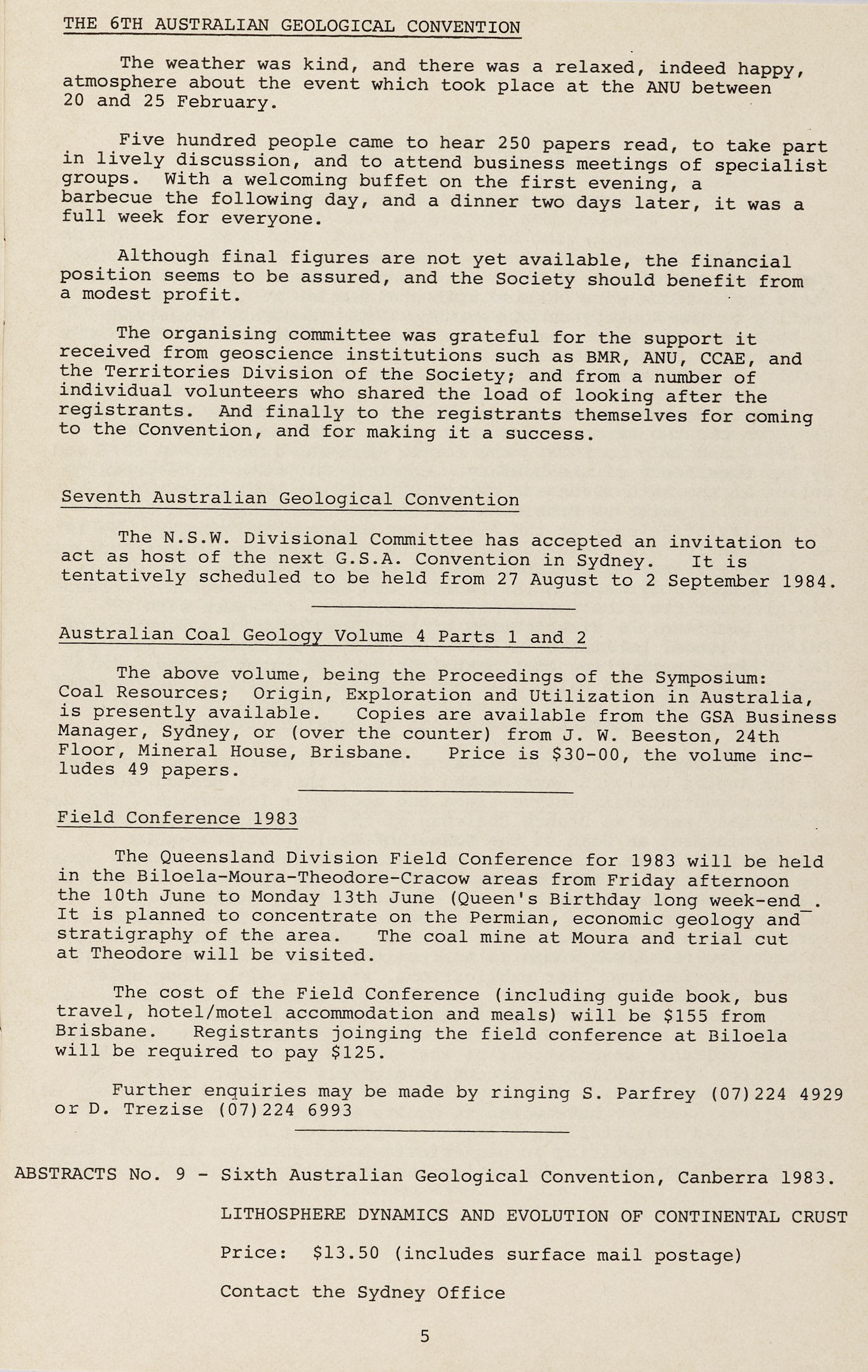 The Queensland Division Field Conference for 1983 will be held in the Biloela-Moura-Theodore-Cracow areas from Friday afternoon the 10th June to Monday 13th June (Queen's Birthday long week-end. It is planned to concentrate on the Permian, economic geology andstratigraphy of the area. The coal mine at Moura and trial cut at Theodore will be visited.