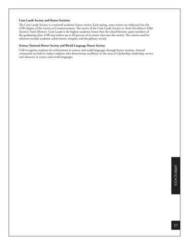 Cum Laude Society and Honor Societies The Cum Laude Society is a national academic honor society. Each spring, some seniors are inducted into the GSB chapter of the society at Commencement. The motto of the Cum Laude Society is: Areté (Excellence) Diké (Justice) Timé (Honor). Cum Laude is the highest academic honor that the school bestows upon members of the graduating class. GSB may induct up to 20 percent of its senior class into the society. The criteria used for selection include academic achievement, integrity and disciplinary record. Science National Honor Society and World Language Honor Society GSB recognizes students for achievement in science and world languages through honor societies. Annual ceremonies are held to induct students who demonstrate excellence in the areas of scholarship, leadership, service and character in science and world languages.