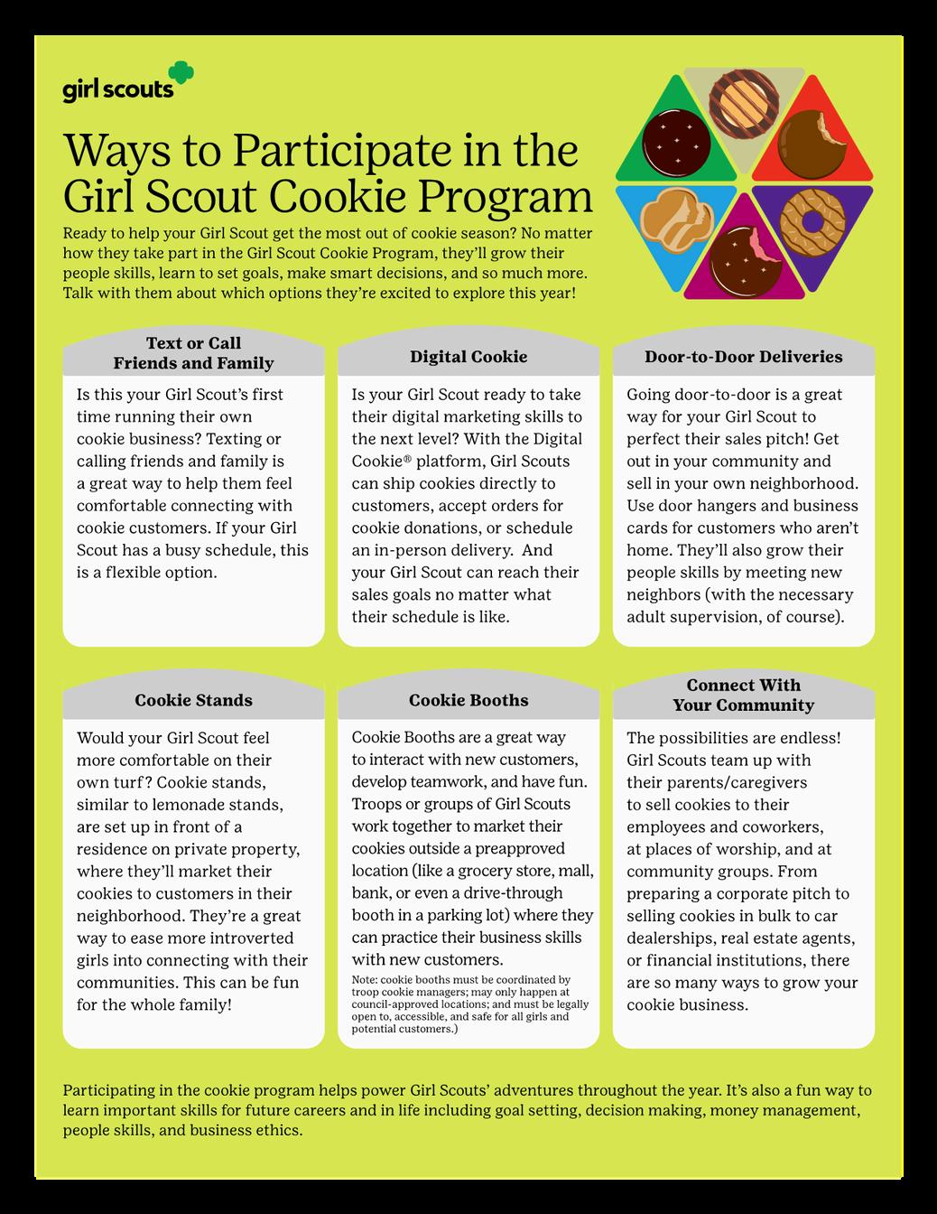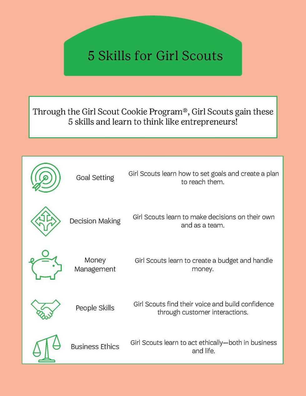 The Girl Scout Cookie Program provides opportunities for participants to learn a variety of business skills such as: