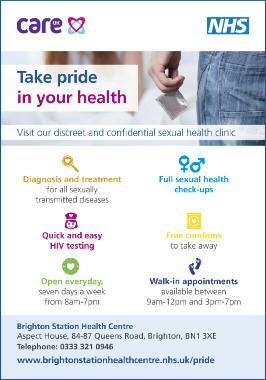 Free confidential testing & treatment for STIs including HIV, plus Hep A & B vaccinations. Claude Nicol Centre, Sussex County Hospital, on Weds from 5-8pm. Tel: 01273 664721 or www.brightonsexualhealth.com