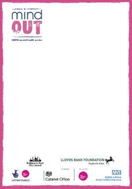 Independent, impartial info, guidance for LGBT people with mental health problems. 24 hr confidential answerphone: 01273 234839 or info@mindout.org.uk www.mindout.org.uk