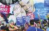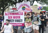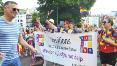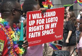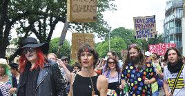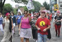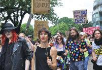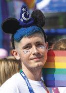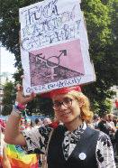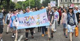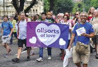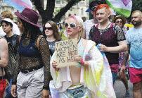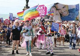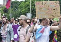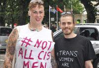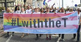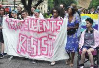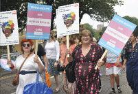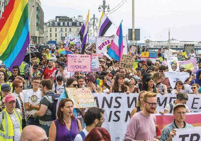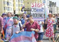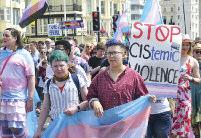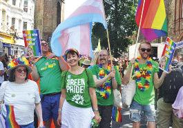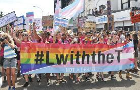 The parade was led by a group of suppor ters from the trans communities spor ting a #LwiththeT banner and protest groups were accommodated throughout the parade