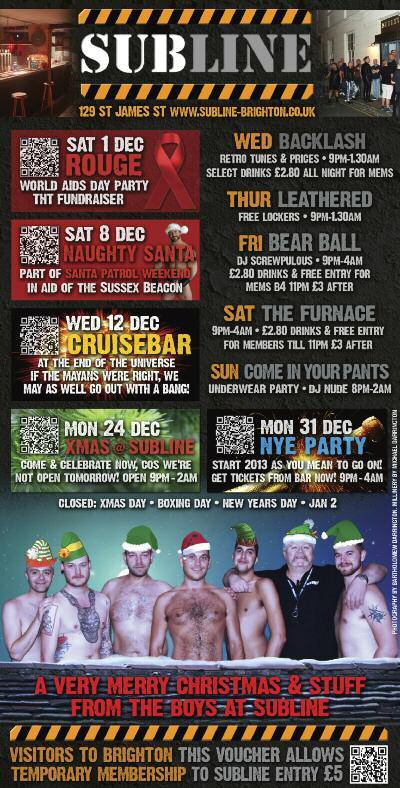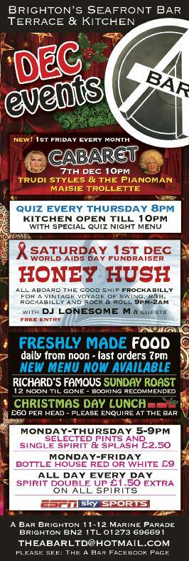 ▼ WE A L L L IV E TOGETHER - A CONCERT FOR WORLD AIDS DAY: St Mar y’s Church, St James’ Street, Sat Dec 1, 7 30pm with The Brighton Gay Men’s Chorus, The R ainbow Chorus, Qukulele, R esound and The Theatre Workshop Compered by Neil Bar tlett OBE The concer t will feature a joint performance of the first international OutPostChoir anthem, You Make Me Proud composed by Howard Alexander Proceeds to Rainbow Fund Tickets on the door or from: www.brightongmc.org