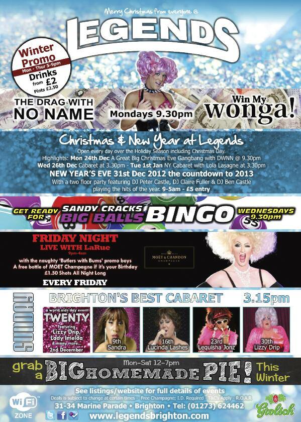 ▼ LEGENDS: 20TH BIRTHDAY and World AIDS Day event, 3.30pm with Lady Imelda, Lizzy Drip, DJ Claire Fuller and many more All proceeds to the Sussex Beacon