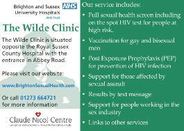 Gay men’s sexual health clinic Wed 5-6 30pm Opposite Royal Sussex County Hospital entrance Abbey Rd Tel: 01273 664721