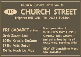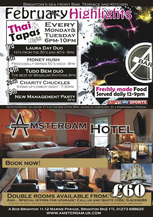 MUSTDOBETTER IvisitedBrightonforninedays betweenChristmasandNewYear andwasverydisappointedwith whatwasonofferfortheGay visitor.Midweekthebarswere quiet,infactonsomenightsthe barswereempty.Apartfrom CharlesStreetandLegendsIsaw veryfewRainbowFlags. WhenItravelIalwayslookfor theRainbowFlagasasignthe venueisgay.Allinallitwasvery disappointingandItravelledup toLondonfourtimesduringmy staytofindsomeexcitement. FriendshadtoldmeBrightonwas afantasticgaydestination,Iam afraidIcannotagreewiththem. JoepKoelmeer Amsterdam