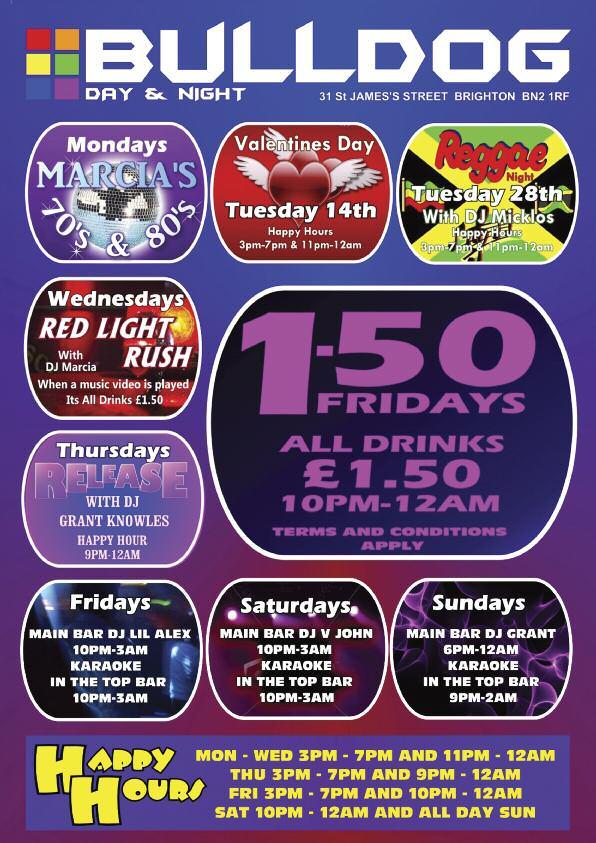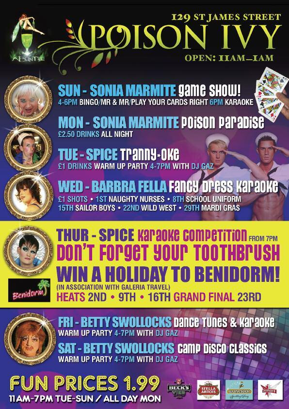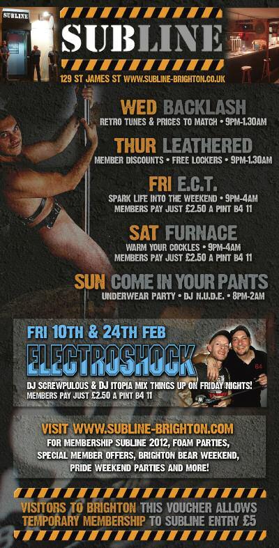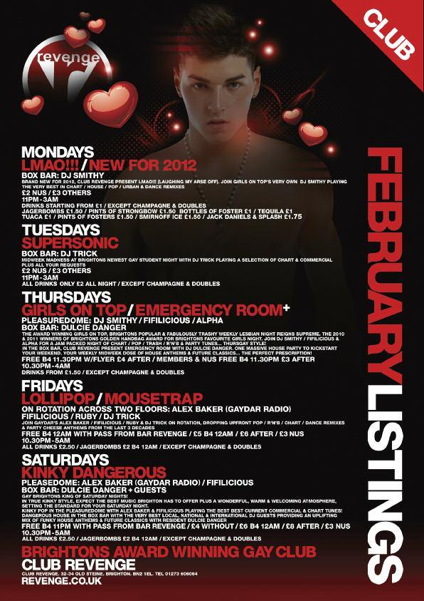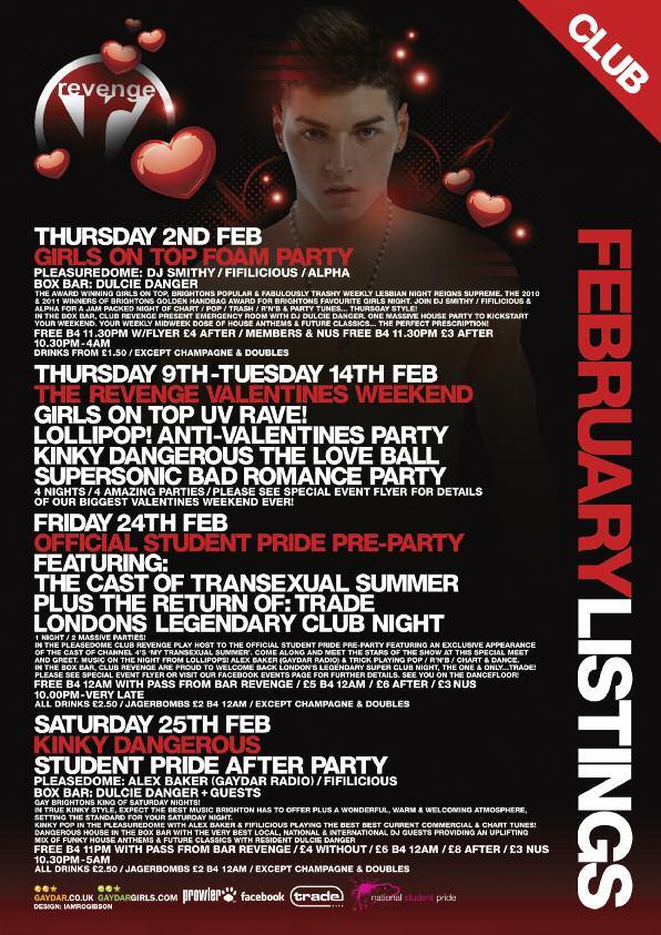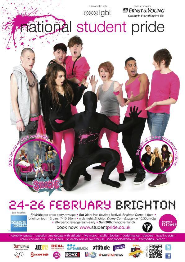 Celebrationsstart Friday24,followingregistrationatCharlesStreetthereisanofficial pre-pridepartyat Revenge. Themaineventstartsfrom 1pm on Saturday25 atthe BrightonDome.Aswellastheregular QuestionTime styledebate,whichthisyear featuresformerNBAbasketballplayer JohnAmaechiOBE,Stonewall'sEditorofthe Year, MatthewTodd from Attitude magazine,gaysoldier JamesWharton and HumanRightsCampaigner PeterTatchell.Therewillalsobestallsandajobfairwith companies Ernst&Young, Accenture, AmericanExpress, Stonewall, IBM, TUC and THT exhibiting.Livemusicwillbe providedbythe BrightonWomen's PerformanceTent organisers.Thecastof Channel4’s MyTranssexualSummer will bethereduringtheday.Theevening festivitiescommencewiththe BrightonPub Tour,whichincludesdrinkdealsandgamesinBrighton’sGayVillage,climaxingwith theclubnightattheBrightonDome, CornExchange withlivemusicincludinggirl band Stooshe,celebrityappearancesandindie/pop/electro/housefromDJs Alex Baker from GaydarRadio,Brighton’s Revenge andLondon’s Onyx and DJJonesy from JuiceRadio.Therewillbesomesurpriseguests(In2010Boyzone’sRonan KeatingmadeasurpriseappearancetoshowsupportforLGBTstudents).Thefunwill continueattheofficialafterpartyat Revenge from 2amonSundaymorning before finishingupwithahangoverSundaylunch.Info/tickets: www.studentpride.co.uk