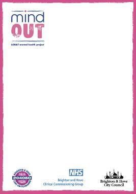 Independent, impar tial info, guidance for LGBT people with mental health problems 24 hr confidential answerphone: Tel: o1273 234839 or info@mindout org uk www.mindout.org.uk