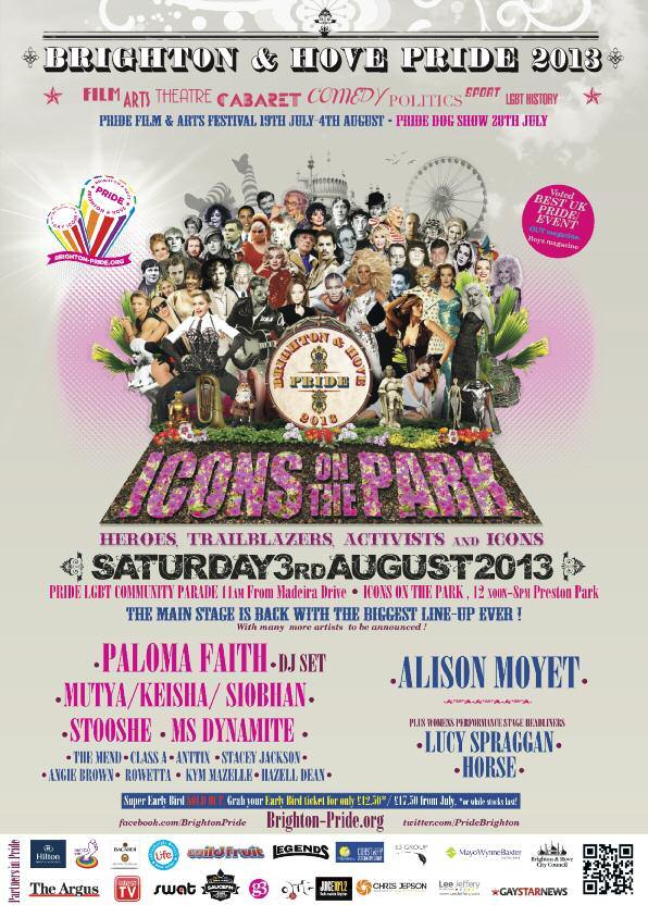 t Alison Moyet joins Paloma Faith and the original Sugababes as the main stage returns to Brighton Pride. One of the biggest ‘Gay Icons’ of them all, Alison Moyet has confirmed she is thrilled to be performing on the main stage on August 3 She joins the original Sugababes and Paloma Faith who will be playing a unique DJ set in the biggest lineup of stars ever announced to appear at Brighton Pride. Dulcie Weaver, Pride organiser, said: “Alison Moyet is a true Icon and a hero to many LGBT people. We are so excited to be able to confirm such an amazing legend for Pride 2013.”