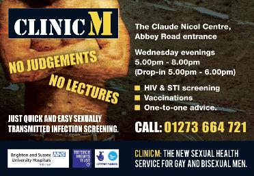 Gay men’s sexual health clinic. Wed 5-6.30pm. Opposite Royal Sussex County Hospital entrance Abbey Rd. Tel: 01273 664721