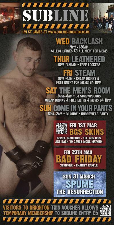Gay men’s sexual health clinic Wed 5-6 30pm Opposite Royal Sussex County Hospital entrance Abbey Rd Tel: 01273 664721