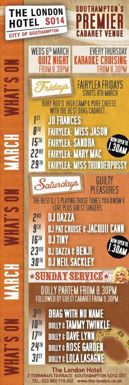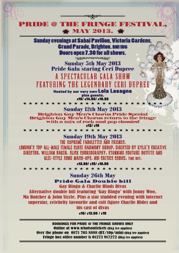 ▼ Brighton Pride are presenting a season of Pride Gala shows in the Ladyboys Sabai Pavilion on Victoria Gardens as par t of the Brighton Fringe 2013 Ceri Dupree, the Queen of female impersonators, gets the season off to a spectacular star t on Sunday, May 5 with a glittering evening of witty, elegant and high energy enter tainment hosted by the brilliant Lola Lasagne and featuring special guest stars during the show