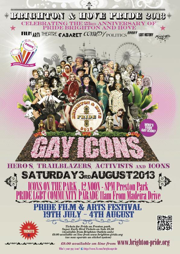 ▼ The organisers of Pride 2013 have announced the theme for this year’s LGBT Pride community parade planned for Saturday, August 3, which culminates with the Pride celebrations on Preston Park The chosen theme is GAY ICONS, which organisers hope will put the spotlight on the vast array of iconic LGBT figureheads, including campaigners and popular celebrities that have shaped and advanced LGBT culture and the cause of equality throughout history