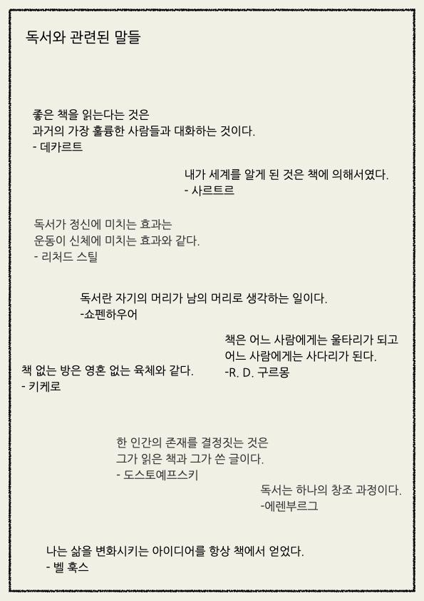 책방을 어떻게 사용해야 하는지에 대한 안내문도 작성했고 독서와 관련된 명언을 적어 놓은 프린트물도 생각해 보았습 니다. 안내문, 명언 16