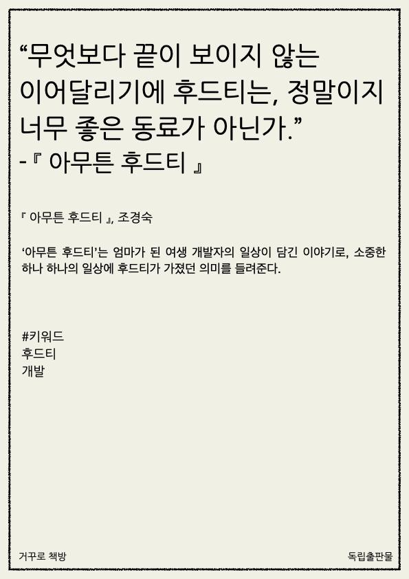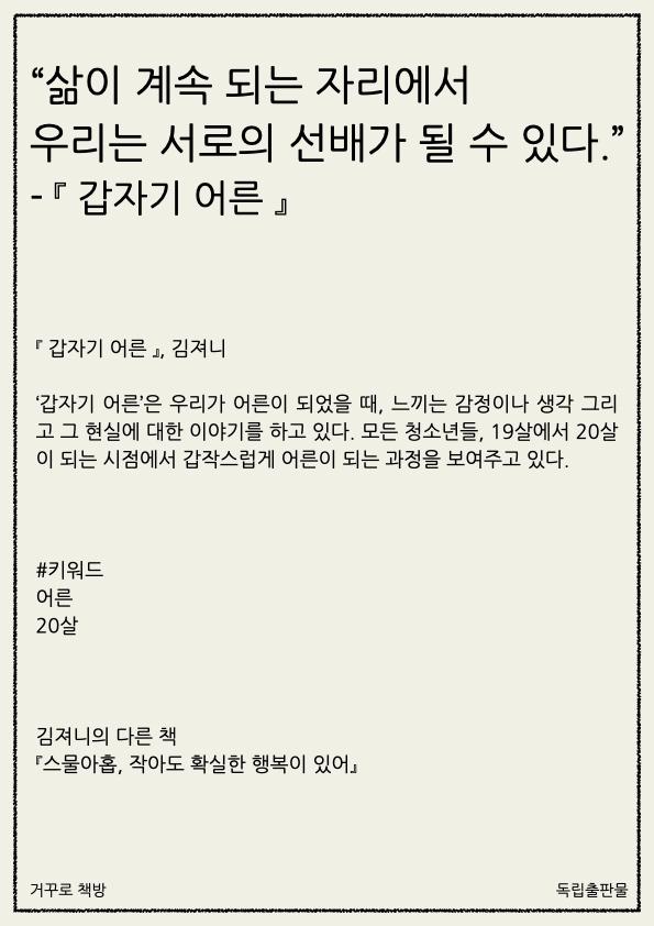 학교 운영부에서 함께 읽었던 독립출판물에 대한 간단한 설명글도 받아서 어떻게 프린트물을 만들지 생각해 보았습니 다. 안에 들어간 내용은 책속에서 발견할 수 있는 좋은 문장, 책의 제목과 저자, 책 내용 소개, 키워드, 저자의 다른 책이 입니다. 저는 이런 내용들을 눈에 잘 보이게 함으로써 거캐머들이 책에 대한 궁금증과 관심이 생기도록 하고 싶었습니 다. 독립출판물 설명 프린트물 17