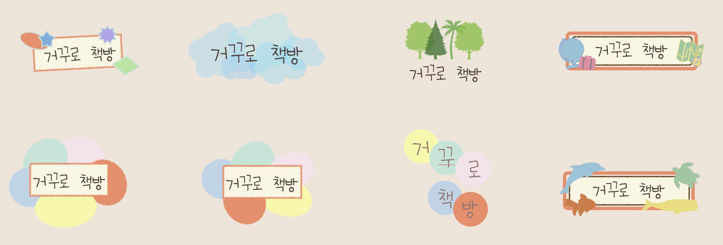 저는 제가 생각한 실행방안들 중 가장 먼저 해볼 수 있는 것들을 해보았습니다. 먼저 저는 거꾸로 책방이 어떤 공간이 되었으면 하는지를 생각해 본 후 간판을 어떻게 만들지, 그리고 공간을 어떻게 꾸밀지 생각해 보았습니다. 저는 먼저 거 꾸로 책방이 프로젝트에 도움을 얻고 역량 성장에 도움을 얻을 수 있는, 성장의 공간이 되었으면 좋겠다고 생각했습니 다. 그리고 성장을 하게 될 때가 경험을 할 때이며 이것을 가장 잘 표현할 수 있는 키워드가 여행이라고 생각해서 여행 이라는 키워드에 맞게 간판을 만들고 공간을 어떻게 꾸밀지 생각해 봤습니다. 간판 후보 14