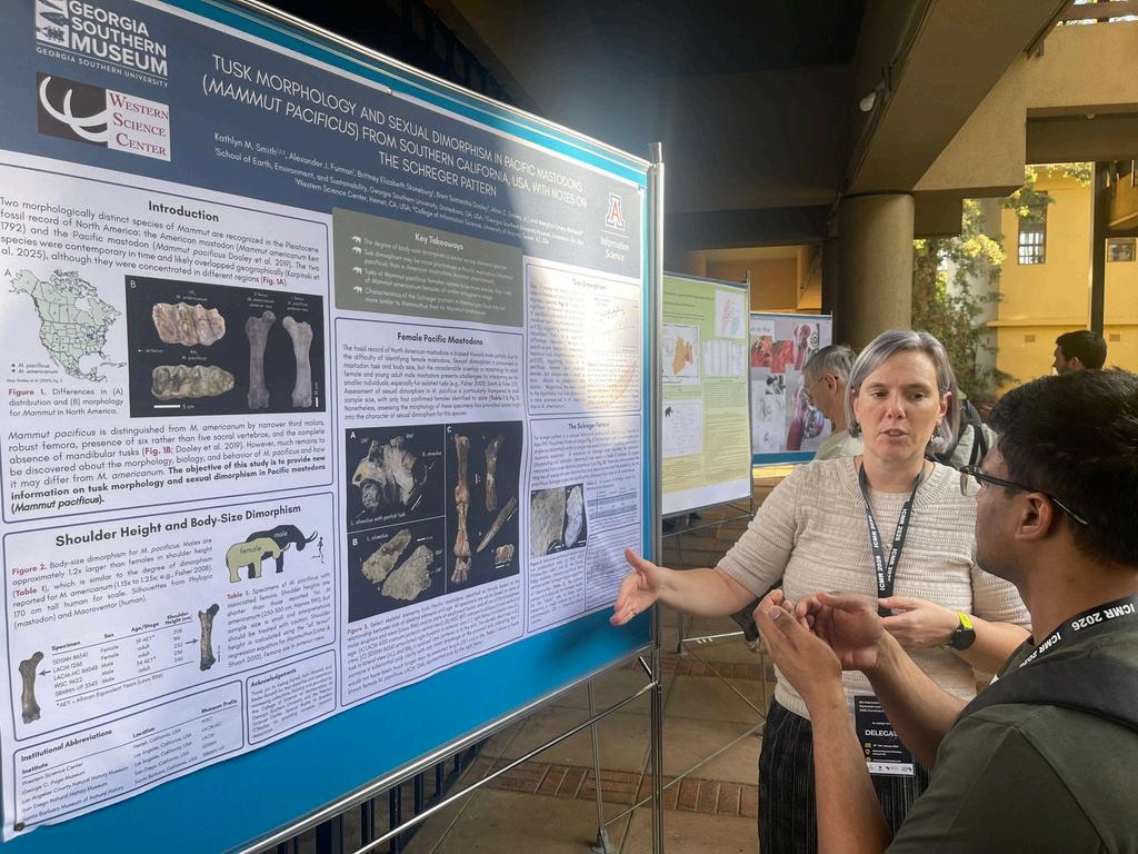 Lastweek,Dr.KatySmithfromSEESpresentedherresearchattheInternationalConferenceon MammothsandTheirRelativesinNairobi,Kenya.Standingbesideherpresentationslide,sheshares findingsfromhertalk,“TuskmorphologyandsexualdimorphisminPacificmastodons(Mammut pacificus)fromsouthernCalifornia,USA,withnotesontheSchregerPattern.”TheresearchwascoauthoredbyAlexFurman,arecentSEESalum