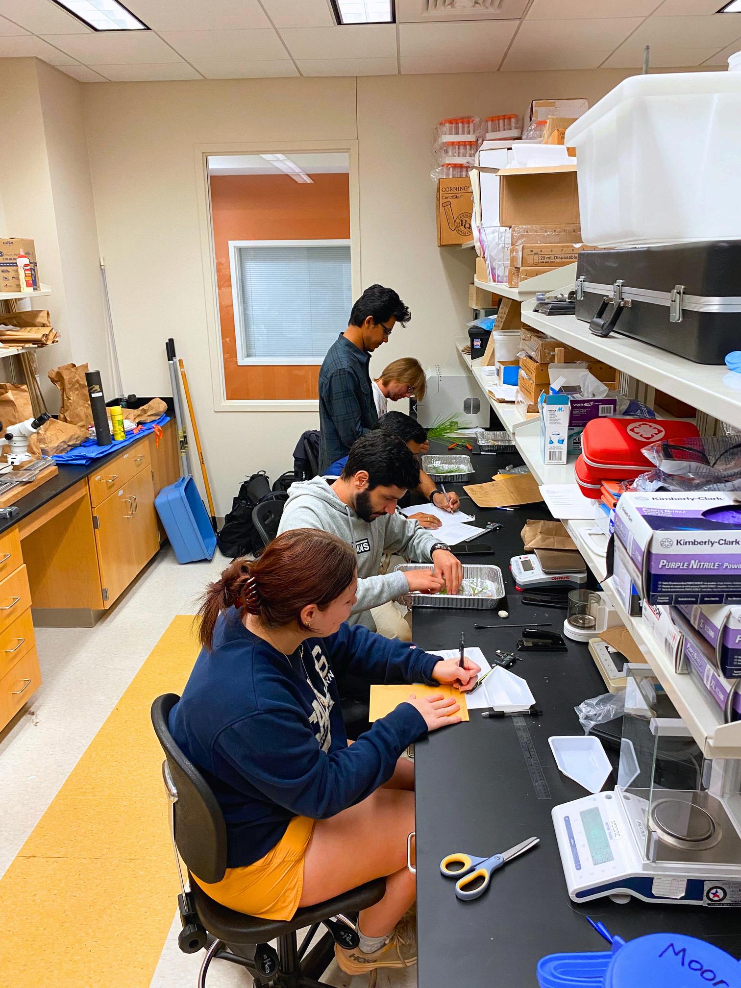 Last week, Dr. Georgianne Moore (Biology) and members of her lab team worked on processing tree samplescollectedfromSapeloIsland.Theirresearchinvolvesharvestingentiretreesandanalyzingleaves andbranchestomeasureoverallbiomass,leafarea,leaftraits,andsaltcontentinbothleavesandstems.