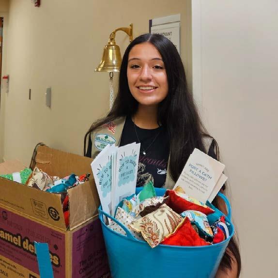Kendall of Troop 2820 in Forsyth County unlocked an interest in medical careers as she earned the Girl Scout Silver Award by supporting her local cancer center. Kendall sewed 73 port pillows to increase patients’ comfort throughout their chemotherapy treatments. She also made two brochures - one about what the pillows are, and one about how to make them. Then she made two videos - one in English and one in Spanish about how to make the pillows. During her visit to the Cancer Institute at Novant Health, Kendall met with nurses, watched a nurse access a port, met with patients and gave out a few pillows.