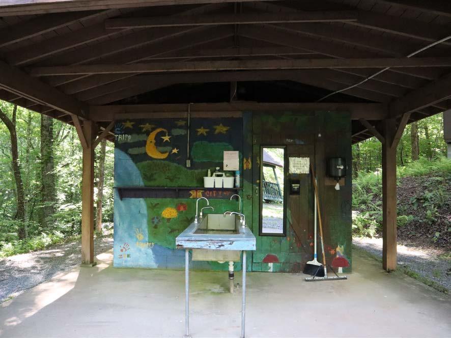 The upstairs of the dining hall includes an area to seat up to 180 people at tables and a large, fully equipped, institutional kitchen. The winterized, handicapped accessible dining hall can be used for games, dancing, instruction or other group gatherings. Serving options include both family style and cafeteria style. Below the dining hall is a large concrete-floored, open sided room with picnic tables and an air-conditioned art/ craft room for 30 (storm shelter). There is a fireplace on the upper and lower levels. Bathrooms are located downstairs. The camp’s climbing wall is attached to an outside wall of the building.