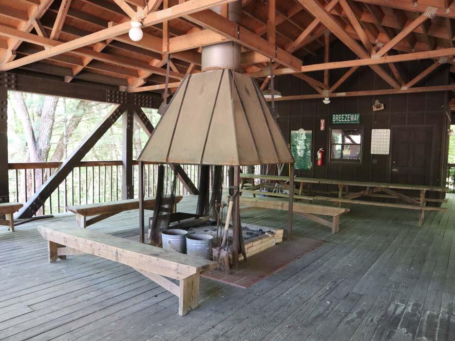 Primitive shelter with a nearby bathroom. Great for groups needing a day shelter as a home base. There is a refrigerator and a firepit for outdoor cooking in the shelter.