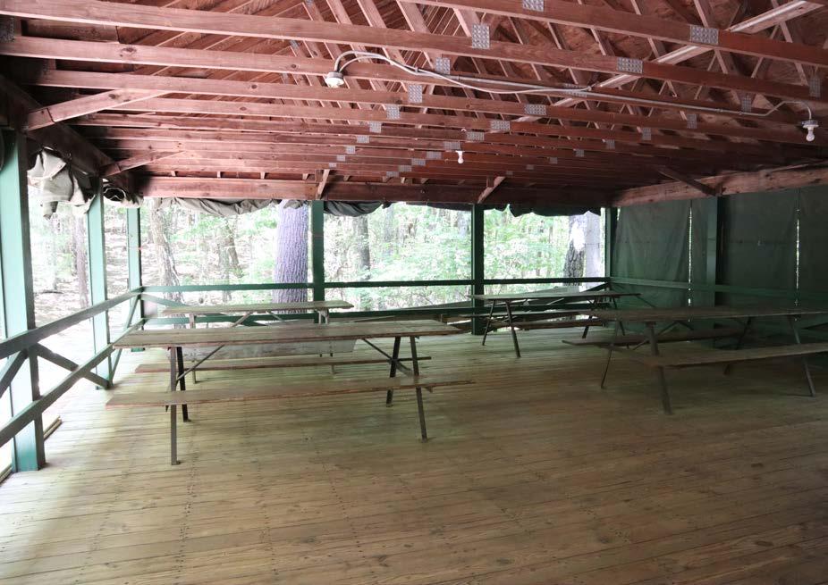 Amongst the trees with our Cadette campers are eight platform tents. Each tent has four beds and zip up screens to keep it cool. The Unit Shelter has picnic tables and an outdoor kitchen containing a firepit and a refrigerator. There is a bathhouse within the unit.