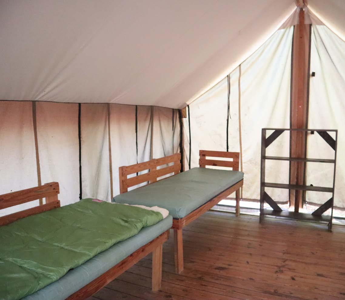 Deep in the woods where our Seniors/Ambassadors stay are eight platform tents that scream adventure. Each tent has four beds and zip up screens to keep it cool. The Unit Shelter has picnic tables and an outdoor kitchen containing a firepit and a refrigerator. There is a bathhouse within the unit.