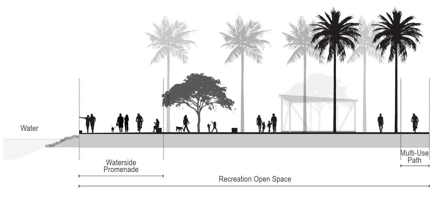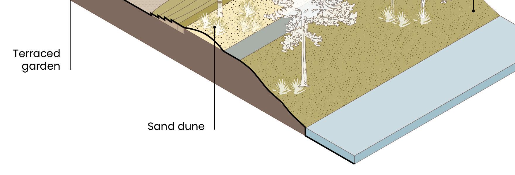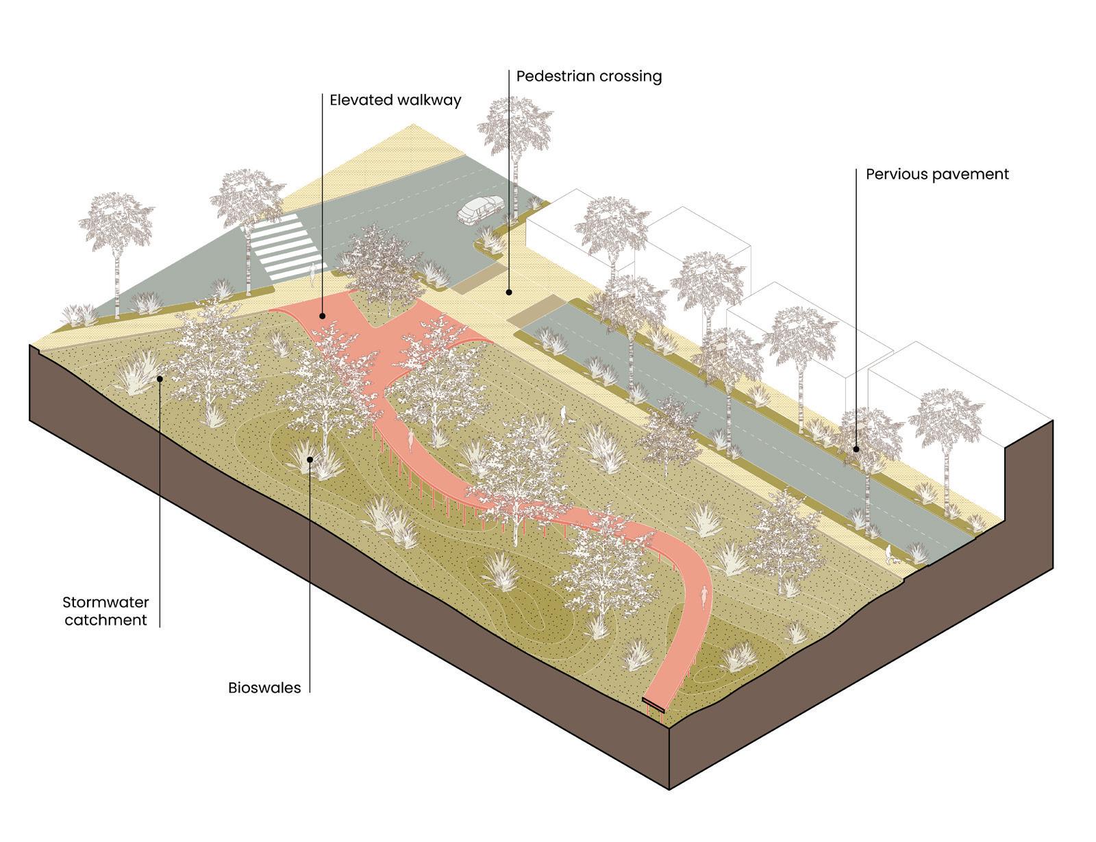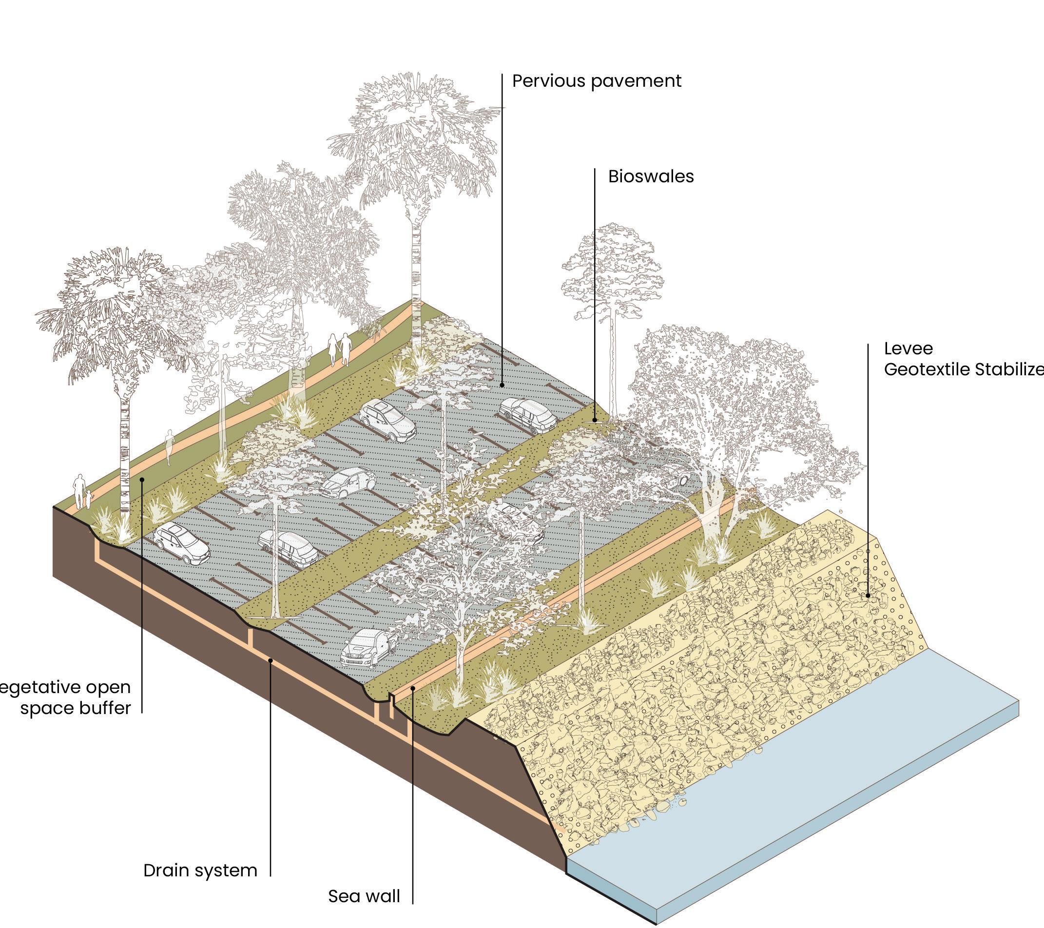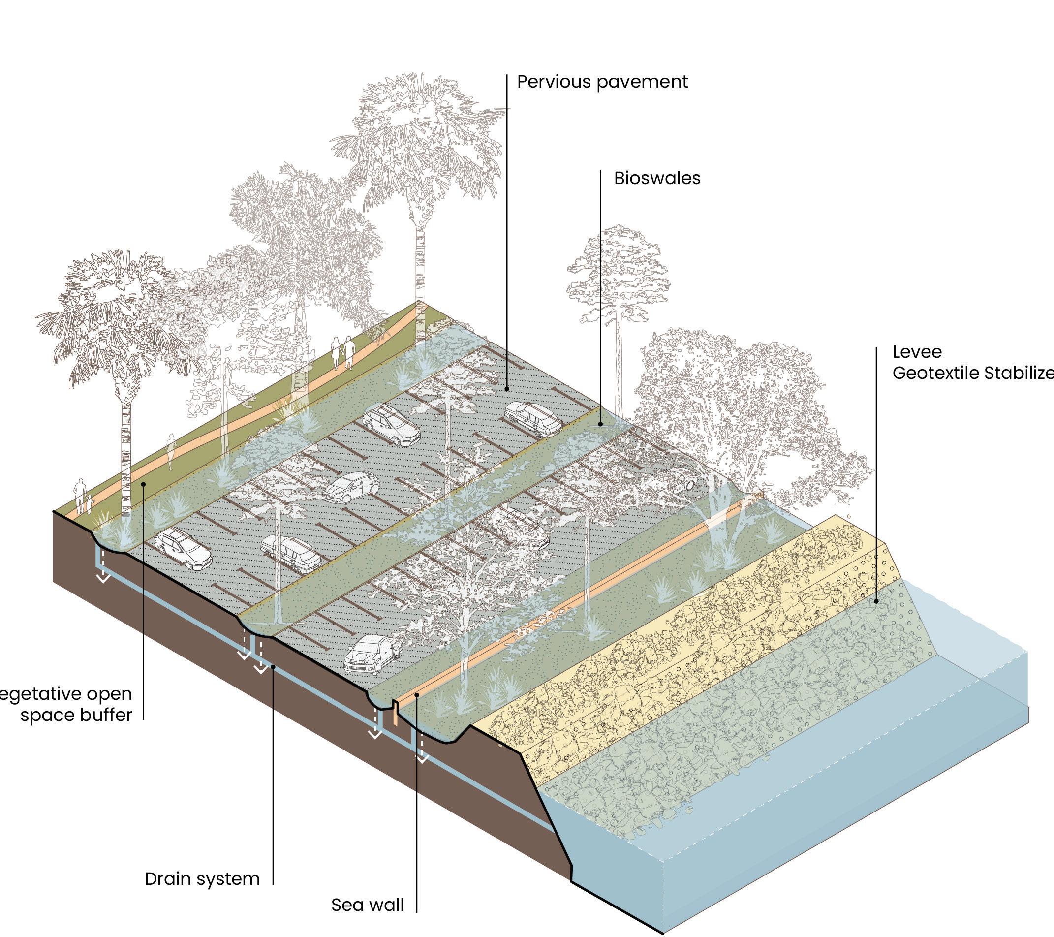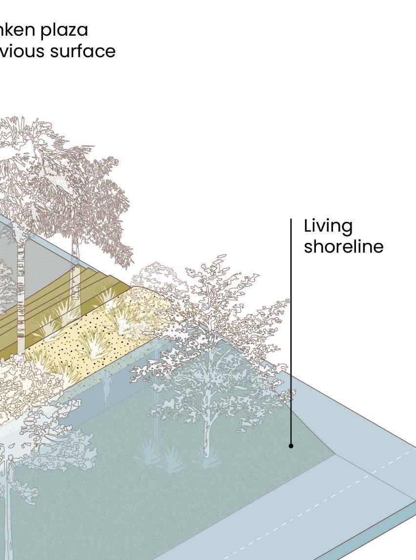Coastal surge and flooding, stormwater, heat and biodiversity adaptation strategies integrated as lush, active public spaces.