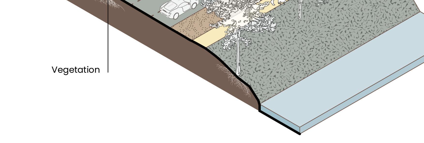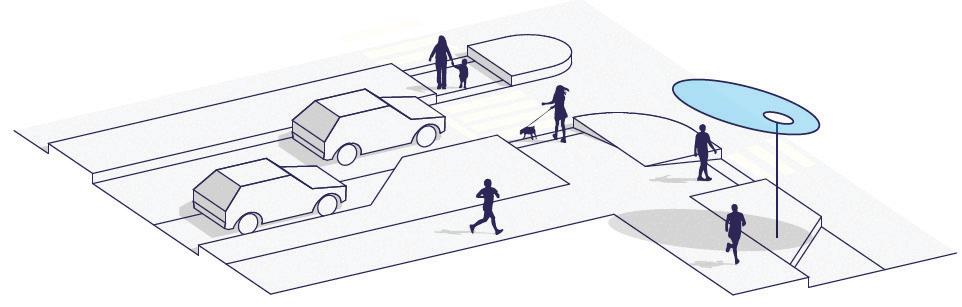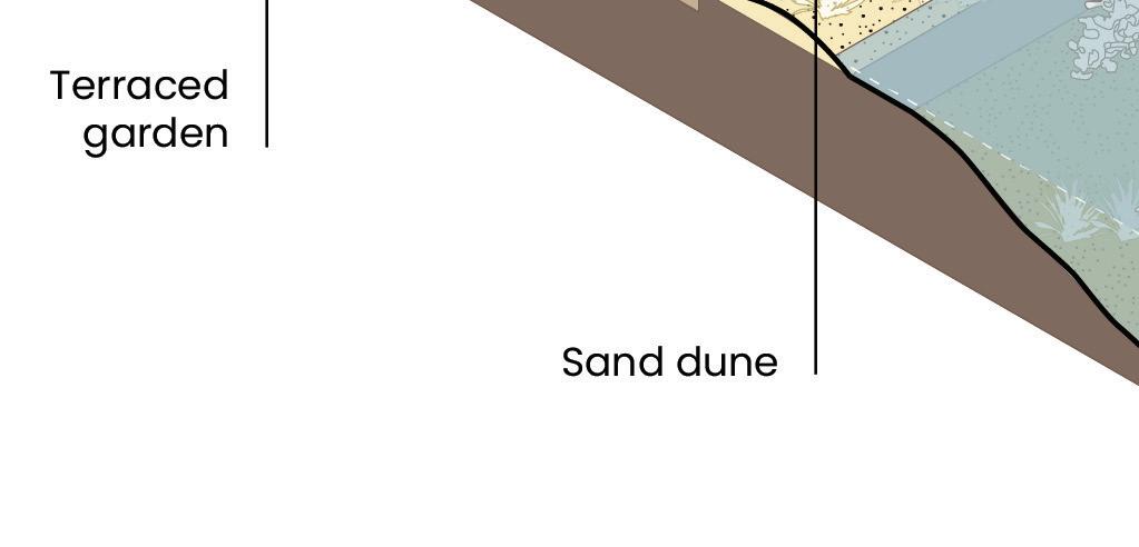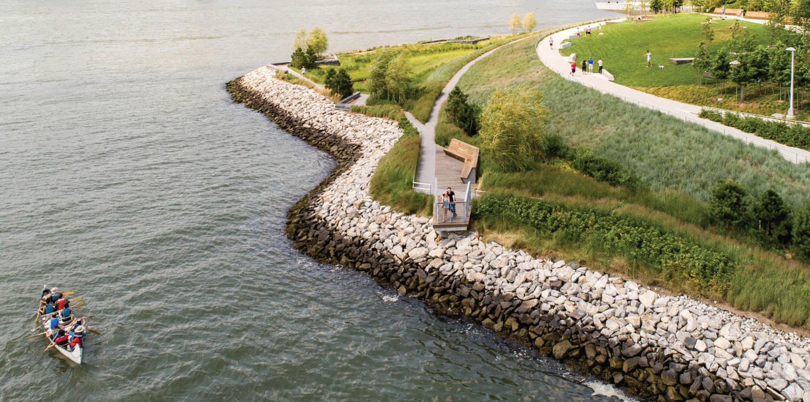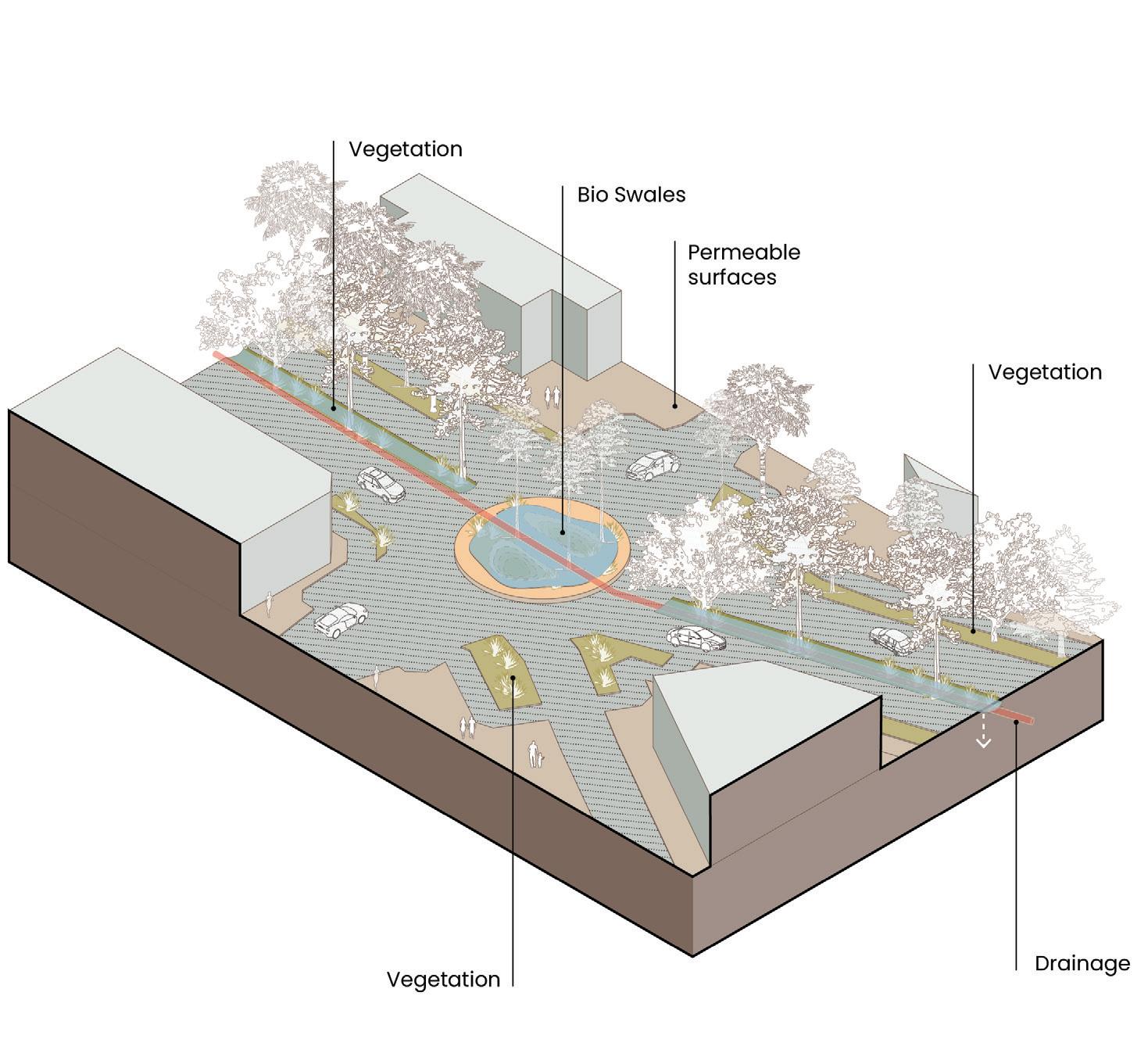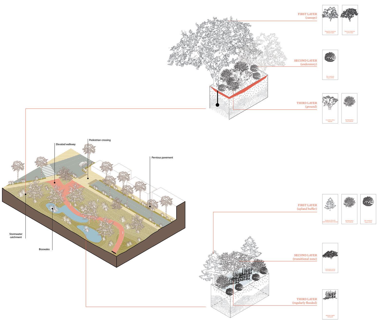 Coastal surge and flooding, stormwater, heat and biodiversity adaptation strategies integrated as lush, active public spaces.