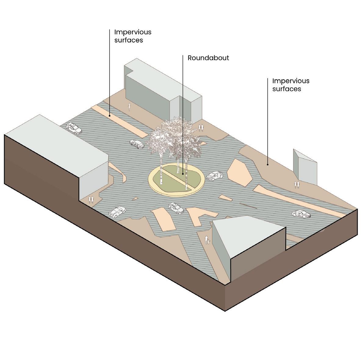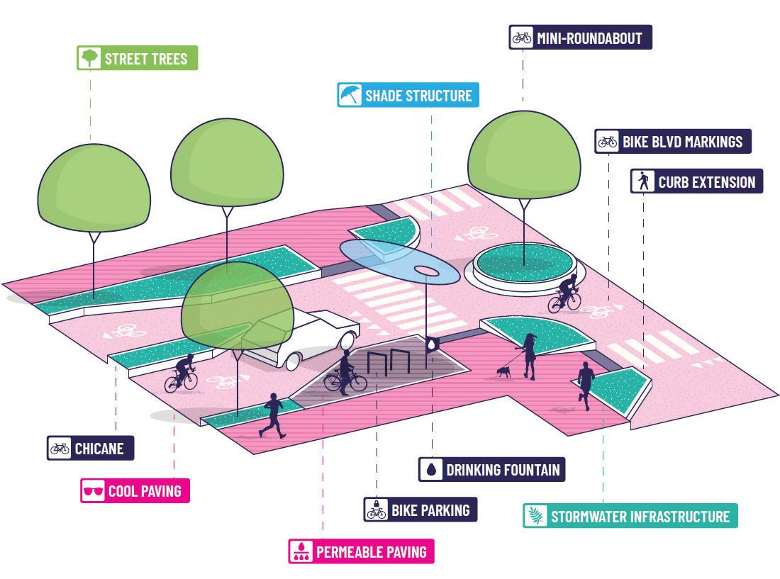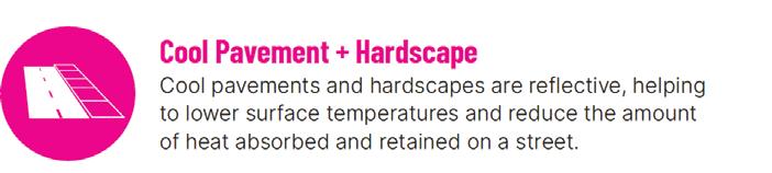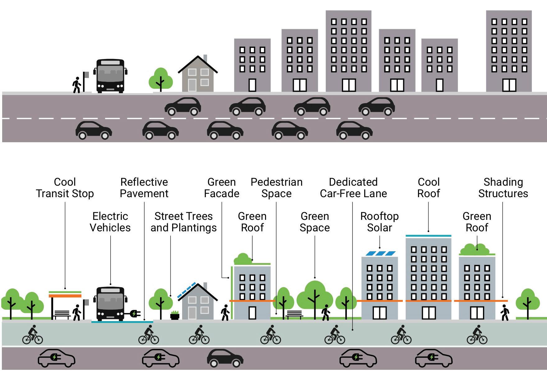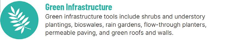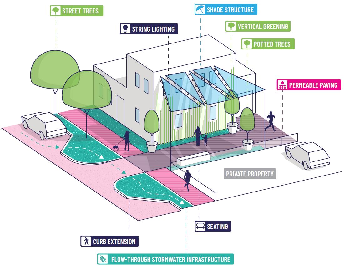 Urban streets can be adapted with stormwater, heat, and biodiversity strategies in the public right-of-way as well as on building facades.