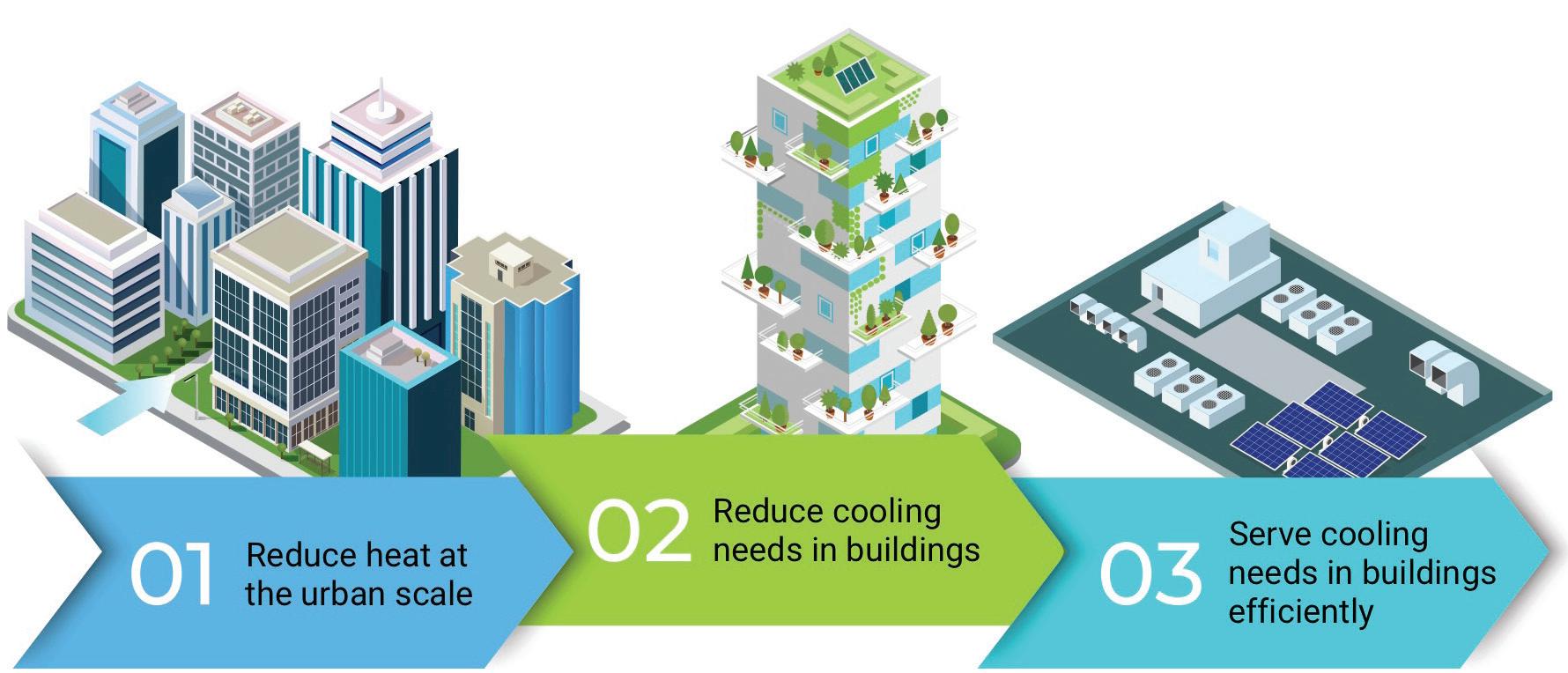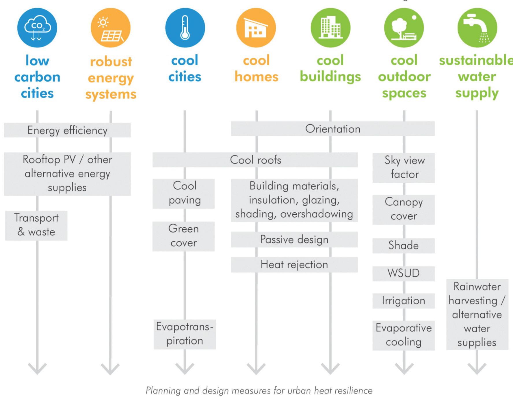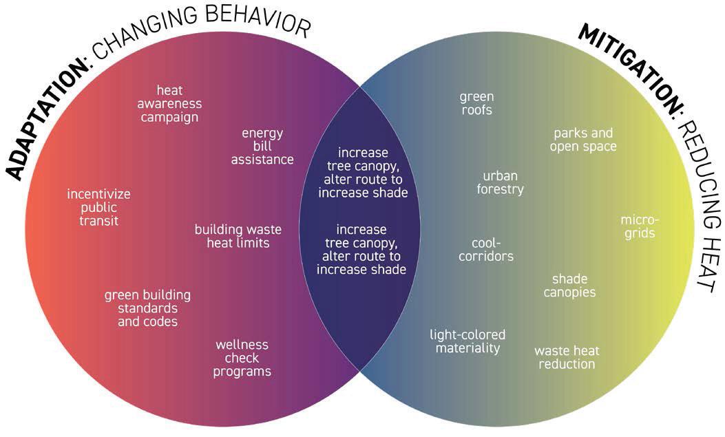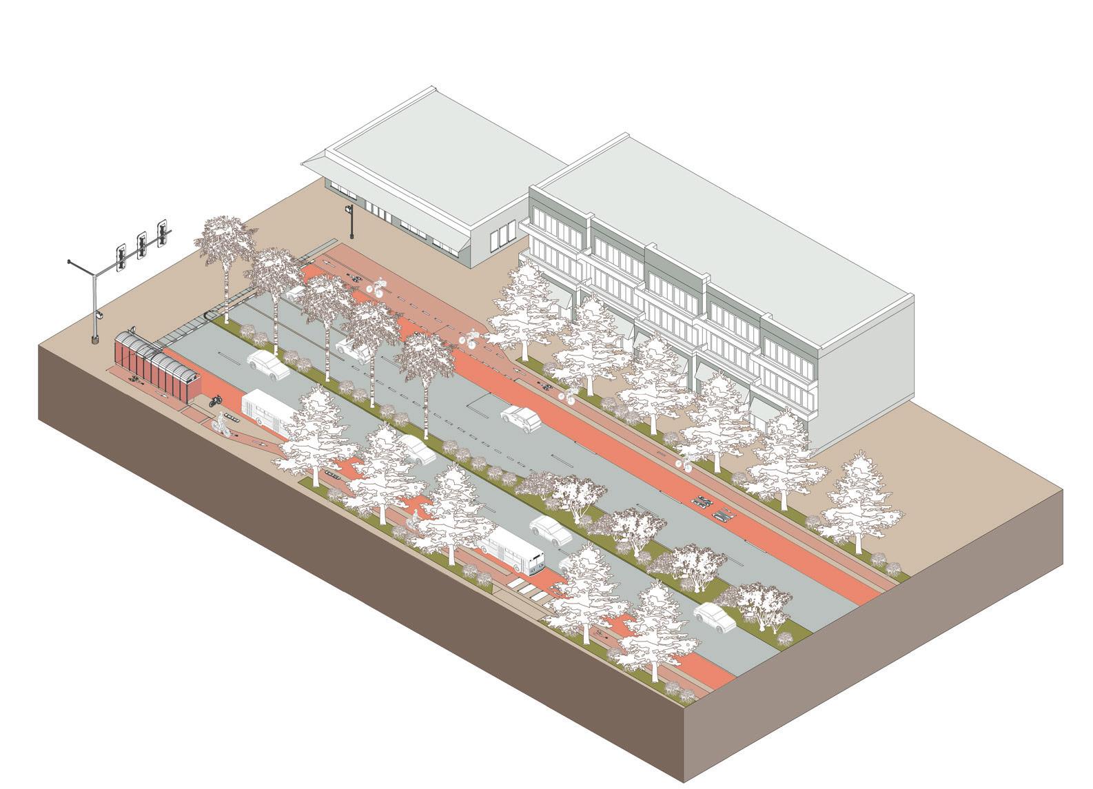 Urban streets can be adapted with stormwater, heat, and biodiversity strategies in the public right-of-way as well as on building facades.