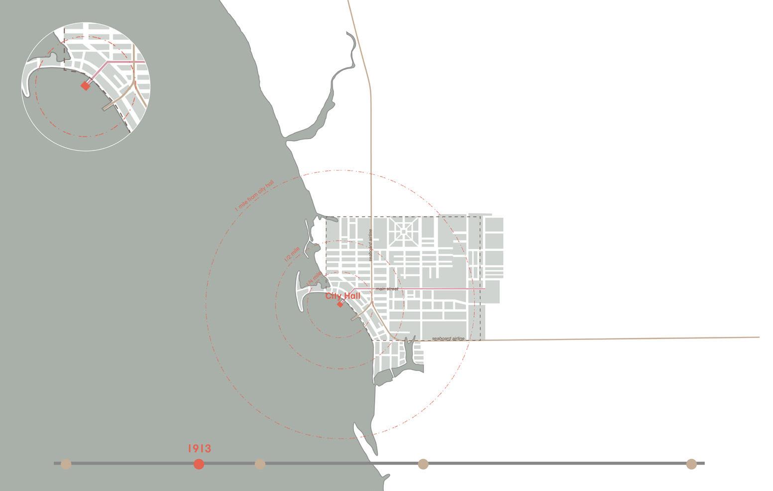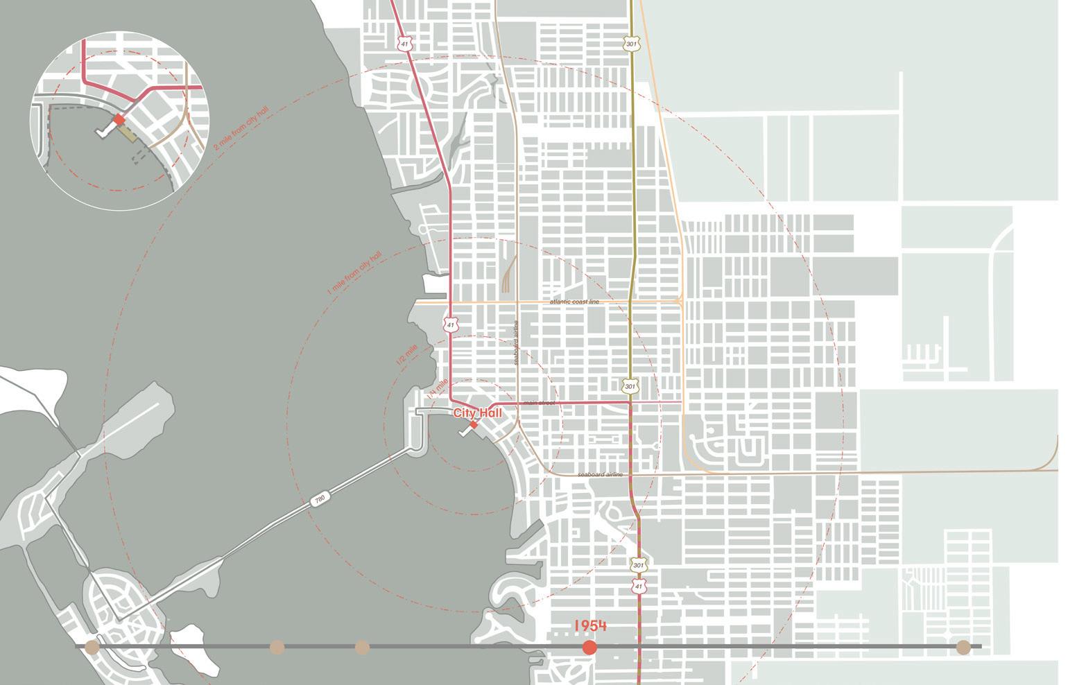 Sarasota’s landscape and society have been shaped by shifting shorelines. Once inland during the Ice Age, it became a tropical coast where the Calusa built water-based societies. Spanish colonization disrupted these lifeways, and by the 1800s settlers transformed the land for cattle and agriculture. Urban growth reshaped the bayfront: dredging, bridges, and highways expanded access to barrier islands but cut downtown off from the water. Richard Paulson’s early grid centered on Main Street guided city growth, reinforced by the railway and later highways that made Sarasota a civic and commercial hub. Today, redevelopment projects like The Bay Park and Downtown Master Plan: 2020 aim to reconnect Sarasota with its waterfront, enhance walkability, and guide future expansion.