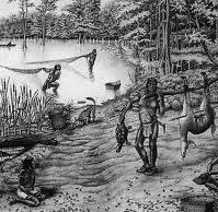 Earth warms, the sea level rises, and the territory becomes more tropical and abundant with bays and streams. Development of village life; better food gathering; fishing in the winter.