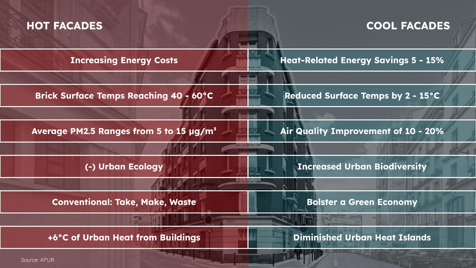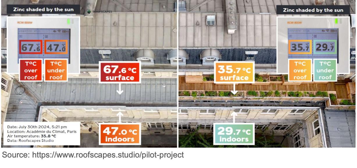 The Roofscapes pilot project included a study of temperature variations pre- and postgreening which showed a 17 degree Celsius reduction in indoor air temperature with the addition of a green roof, during a heat wave of 35 degrees Celsius. Their pilot project is located in central Paris, where the heat vulnerability is very high.