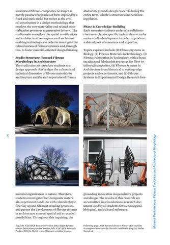 Phase 1: Knowledge-Building Each semester students undertake collaborative research into specific topics relevant tothe entire studio development in order to produce a shared pool of resources and expertise. Topics explored include (1) Fibrous Systems in Biology, (2) Fibrous Materials in Technology, (3) Fibrous Fabrication in Technology with a focus on advanced fabrication processes for fiber-reinforced composites, (4) Fibrous Systems in Architecture from historical to cutting-edge projects and experiments, and (5) Fibrous Systems in Experimental Design Research fore-
